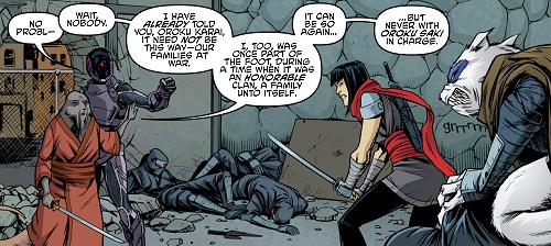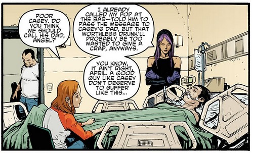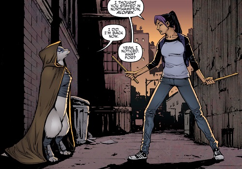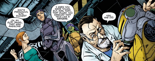 Par la suite, Angel prêta main forte à ses amis lors de la tentative de récupération du Foot Clan par Karai (TMNT #92). Elle se battit avec Alopex pour aider les tortues (TMNT #99) puis sur les toits de l’immeuble lors de l’arrivée des démons et du Dragon (TMNT #100).