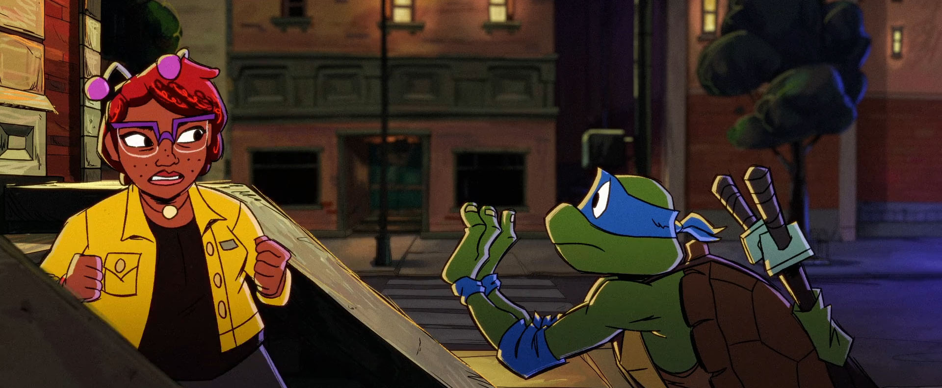 Un soir, l’adolescente reçut un shuriken sur son casque. Elle vit quatre ombres sur les toits de la ville. Elle ne fit pas attention à un malfrat qui dérobait son scooter. Leonardo, qui venait de découvrir la jeune femme, voulut voler à son secours et lui rendre son véhicule. Les tortues le suivirent jusqu’à un hangar. Elles découvrirent plusieurs voleurs, qu’elles neutralisèrent. Il s’agissait de leur premier combat. April n’avait pas peur des mutants et les remerciait pour avoir retrouvé son scooter. Intriguée par ces reptiles, elle leur posait tout un tas de questions. Mais ceux-ci, apprenant qu’elle comptait rédiger un article pour le journal de son école, refusèrent d’être publiés. En revanche, ils acceptaient de l’aider à découvrir qui était Superfly. Les tortues voyaient-là une manière d’être acceptées par la société, qui les dresserait en héros.