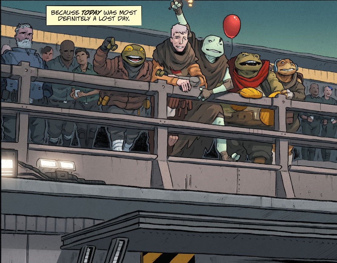 Un jour, April décida d’emmener les quatre tortues visiter les bas-fonds de la ville et surtout le marché noir. Leur maître ne devait rien savoir de tout cela. La femme âgée fit la rencontre dans un premier temps de Tinker Smith II, la fille d’un homme du même nom avec qui April avait l’habitude de faire du troc. Ce dernier était décédé lors de la grande panne de New York et de l’inondation des égouts (The last ronin #4). Sa fille en voulait terriblement à April. Après cela, la femme et les quatre tortues partirent rendre visite aux Purple Dragons. Elle fit la connaissance de leur nouveau chef, le militaire Jigsaw. Si celui-ci se montrait amical, par intérêt pour ce qu’il attendait, il n’hésitait pas à la menacer pour leur prochaine rencontre. Enfin, elle retrouva son vieil ami Avallone, qui fêtait sa retraite au sein de la Résistance. Au cours de ce périple, les petites tortues s’illustrèrent par leur courage et leur ténacité dans un monde qui leur était encore grandement inconnu (Lost day special).
