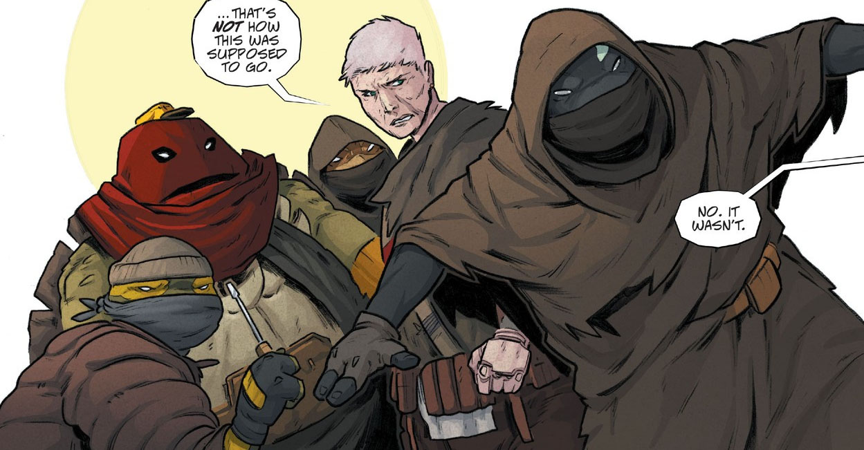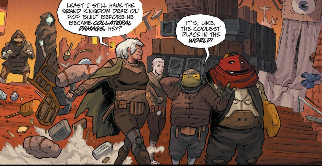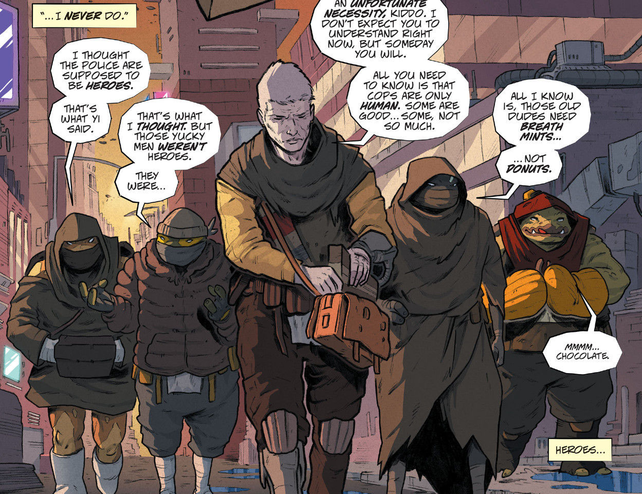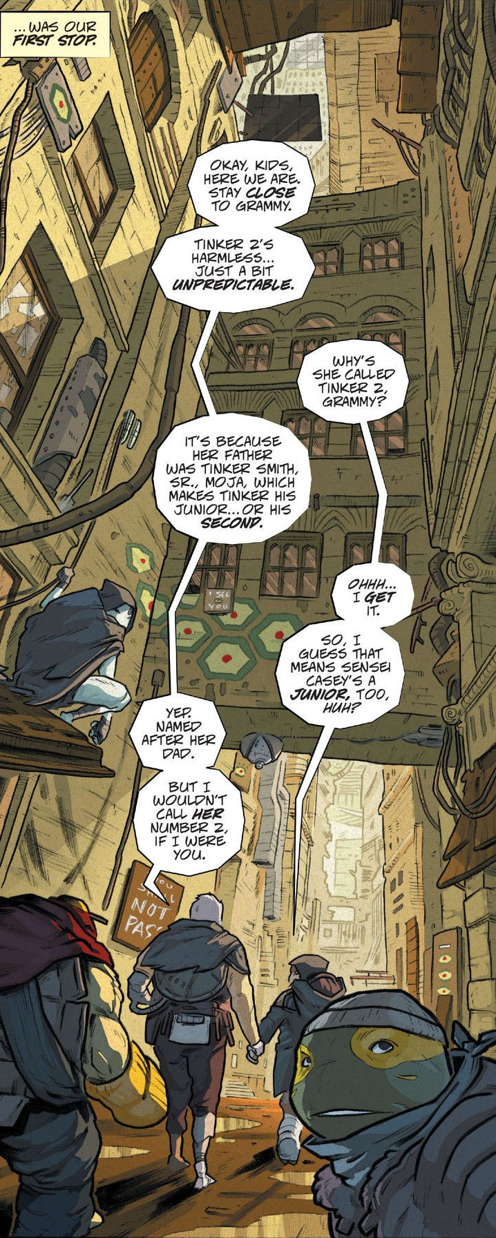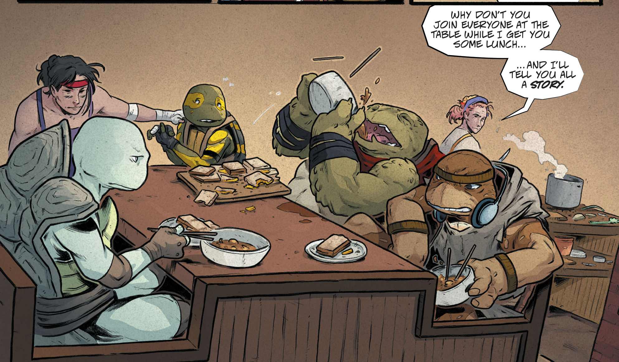L’esprit du professeur Honeycutt avait été transféré dans les ordinateurs du repaire. La vieille dame s’entretenait régulièrement avec l’homme, qui s’était toujours vivement opposé à l’idée de concevoir de nouveaux mutants chéloniens. En outre, le sang de Michelangelo, contaminé depuis son séjour en Mongolie (The lost years #3), utilisé pour leur mutation, avait produit ces pouvoirs inattendus. Hélas pour le robot, celui-ci se fit pirater par une nouvelle attaque des gangs de la ville. Les Purple dragons assiégèrent le repaire, conduisant April à prendre la décision de déclencher le protocole Teddy Bear (The last ronin II #3). Elle savait qu’en parallèle, la Résistance essuyait une lourde attaque. Casey Marie, les tortues, Amanda Konnor et elle se replièrent sur Roosevelt Island. L’ingénieure dû expliquer à sa fille ce qu’elle faisait depuis des années pour protéger la Résistance. Elle lui promettait au passage de ne plus jamais faire de secrets. Le professeur Honeycutt revint également à travers les ordinateurs de la base secrète, bien décidé à protéger son amie. Celui-ci lui apprenait qu’un puissant homme avait restauré la tour d’Oroku Hiroto, officiellement pour construire des logements. Mais il sentait que des choses étranges s’y déroulaient. Les tortues partirent en reconnaissance sur place pour voir ce qu’il s’y passait. Les locaux étaient gardés par des ouvriers adeptes des arts martiaux, qui mirent les reptiles en déroute (The last ronin II #4).