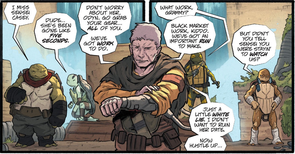 Parallèlement, les petites tortues devinrent des enfants mutants, élevés par April et sa fille, qui avait poursuivi l’entraînement initié par Michelangelo. La femme, devenue âgée, épaulait Casey Marie dans leur enseignement, souvent très houleux (Lost years #1).