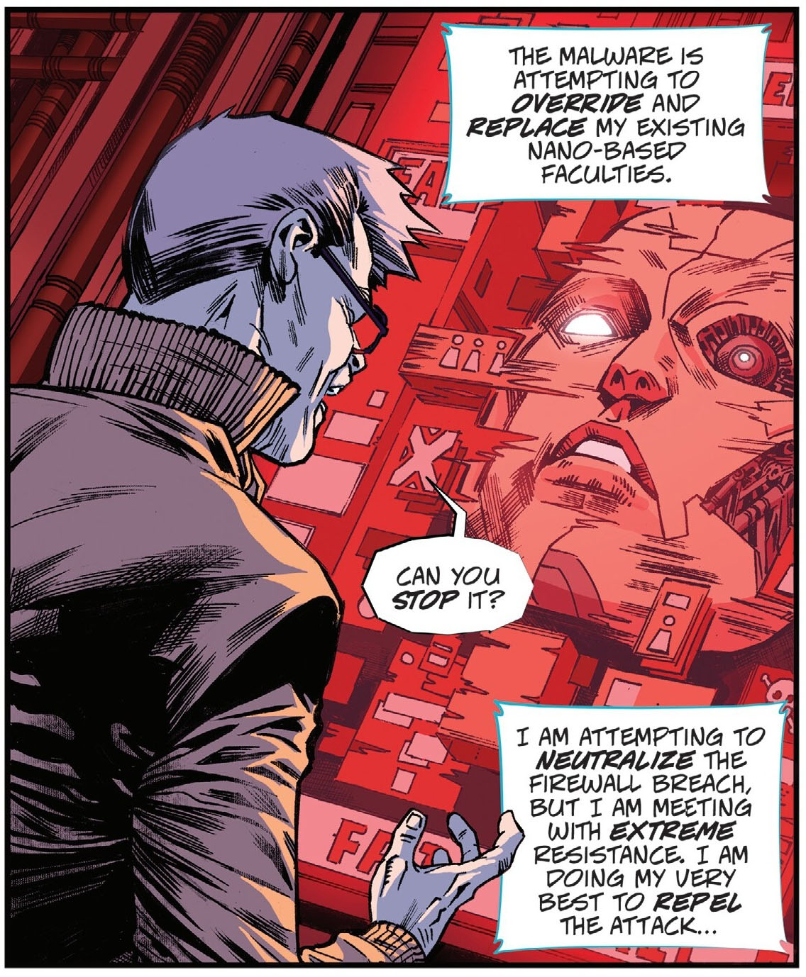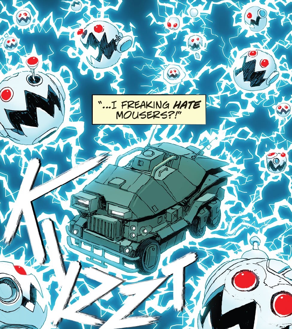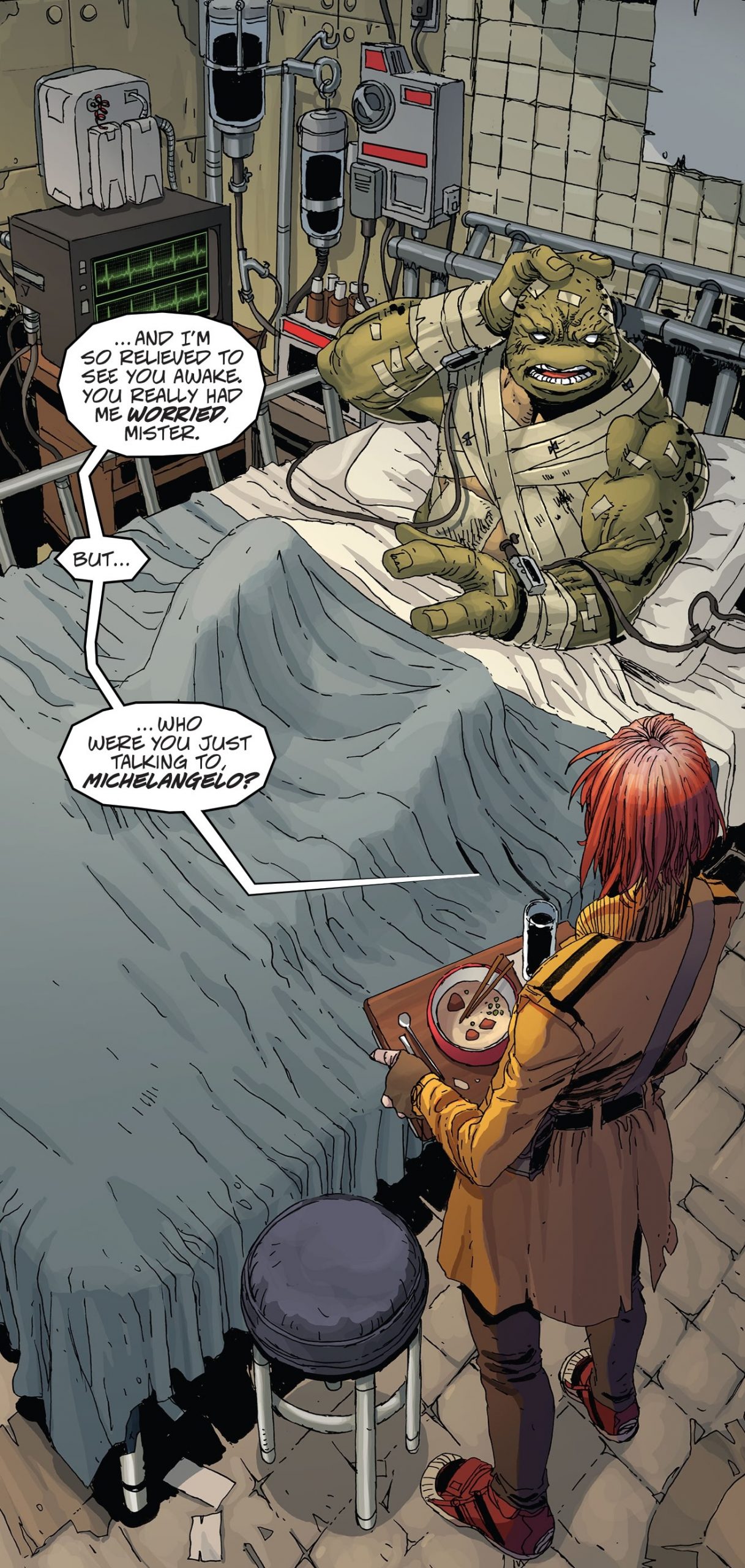 Dépassée par le mal que lui avait annoncé Casey, elle cherchait à contacter les tortues, en vain. Seul Donatello était encore en contact avec elle et lui aurait suggéré d’utiliser le Fugitoid, endormi, pour contacter ses frères grâce à ses capacités télépathiques (en savoir plus).