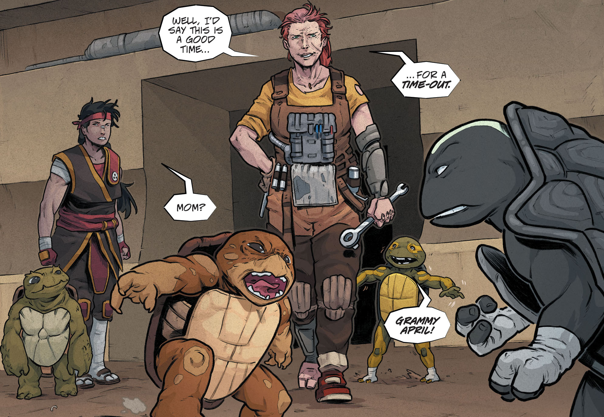 Par la suite, Casey Marie adopta quatre bébés tortues sur qui elle veillait, un tube de mutagène à proximité. April continuait de réparer du matériel dans les égouts, cachée avec sa fille dans le repaire de leurs anciens amis (The last ronin #5). Avec l’aide du professeur Honeycutt et d’échantillons de sang, April avait conçu un mutagène pour transformer ces reptiles en une nouvelle génération de Tortues Ninja.