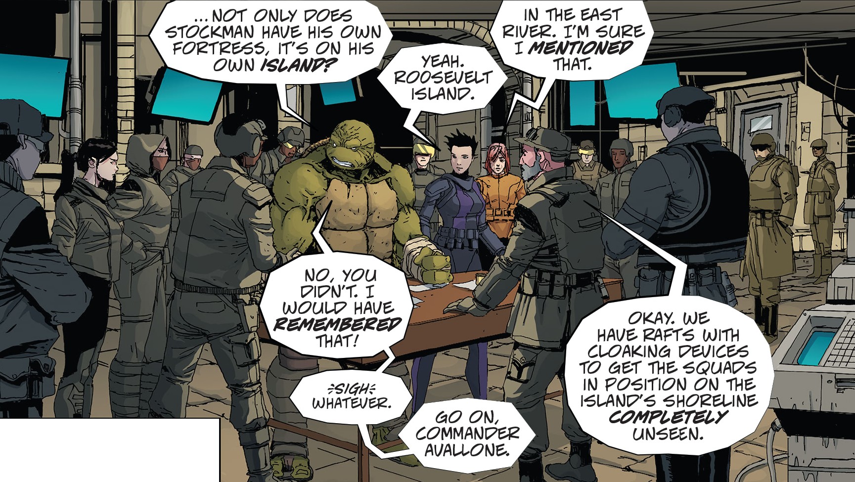 Ensemble, ils prirent la tête de la Résistance pour mener un assaut contre Hiroto. Il serait impossible de l’emporter en l’attaquant de front. Leur plan était de s’en prendre aux installations de Baxter Stockman, sur son île de Roosevelt. Le scientifique s’était allié à Hiroto depuis plus d’une quinzaine d’années. S’ils ne s’appréciaient guère, ils nécessitaient d’une aide mutuelle. Stockman produisait l’électricité de New York et était le concepteur des robots du Foot Clan. En désactivant cette source d’énergie, Michelangelo espérait ainsi pouvoir affaiblir Hiroto pour en finir avec lui. April embarquait avec elle la tête du professeur Honeycutt, qu’elle espérait pouvoir remettre en état de marche pour court-circuiter les installations.
