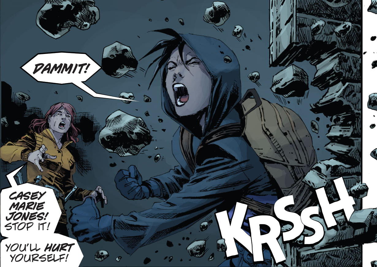 Seize années après la mort de son père, Casey Marie ramena à sa mère une vieille connaissance, trouvée inanimées non loin. Il s’agissait de Michelangelo (The last ronin #1). Les deux vieux amis avaient énormément à apprendre l’un de l’autre. La tortue la croyait morte dans l’explosion des souterrains de sa maison. Cette dernière le pensait également disparu dans les mêmes conditions (The last ronin #4).