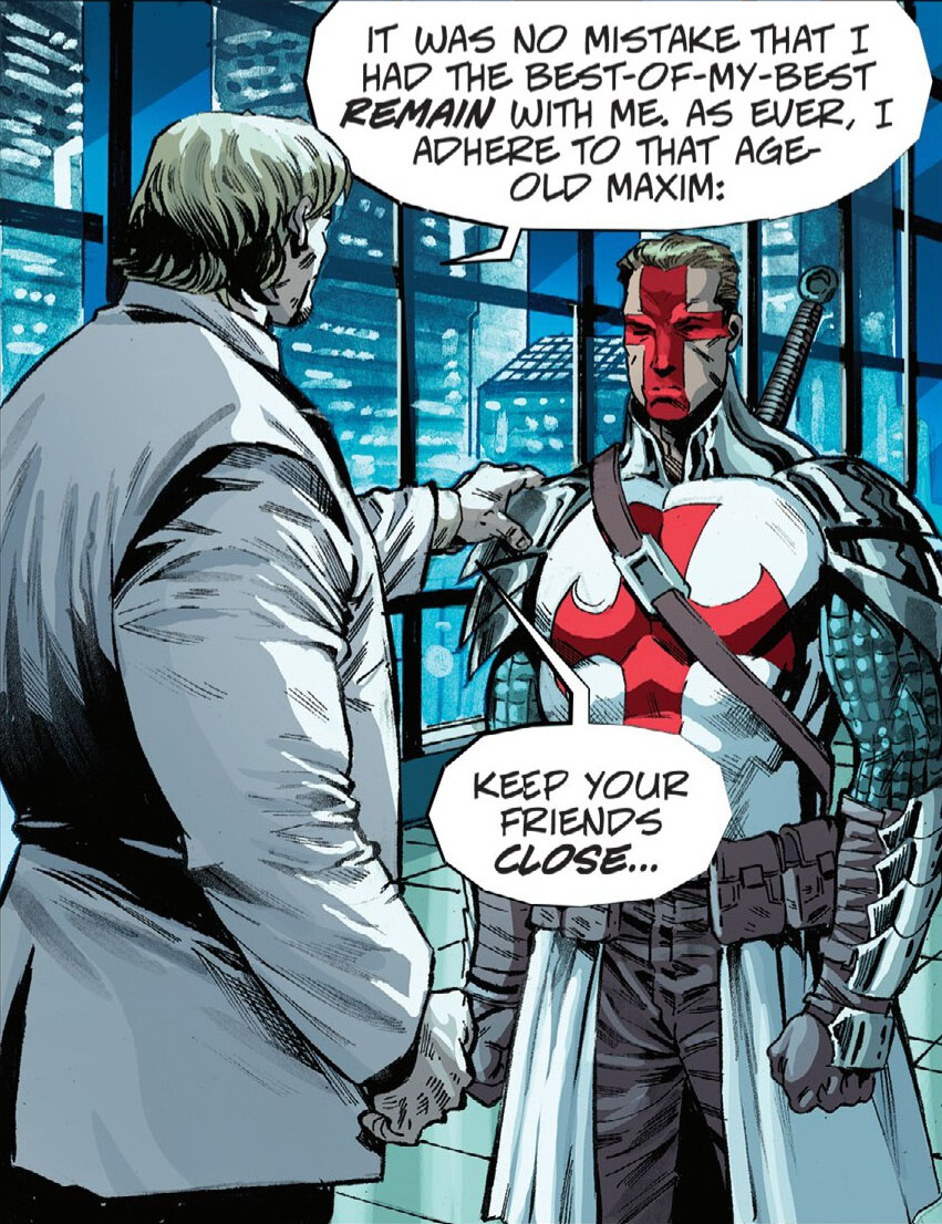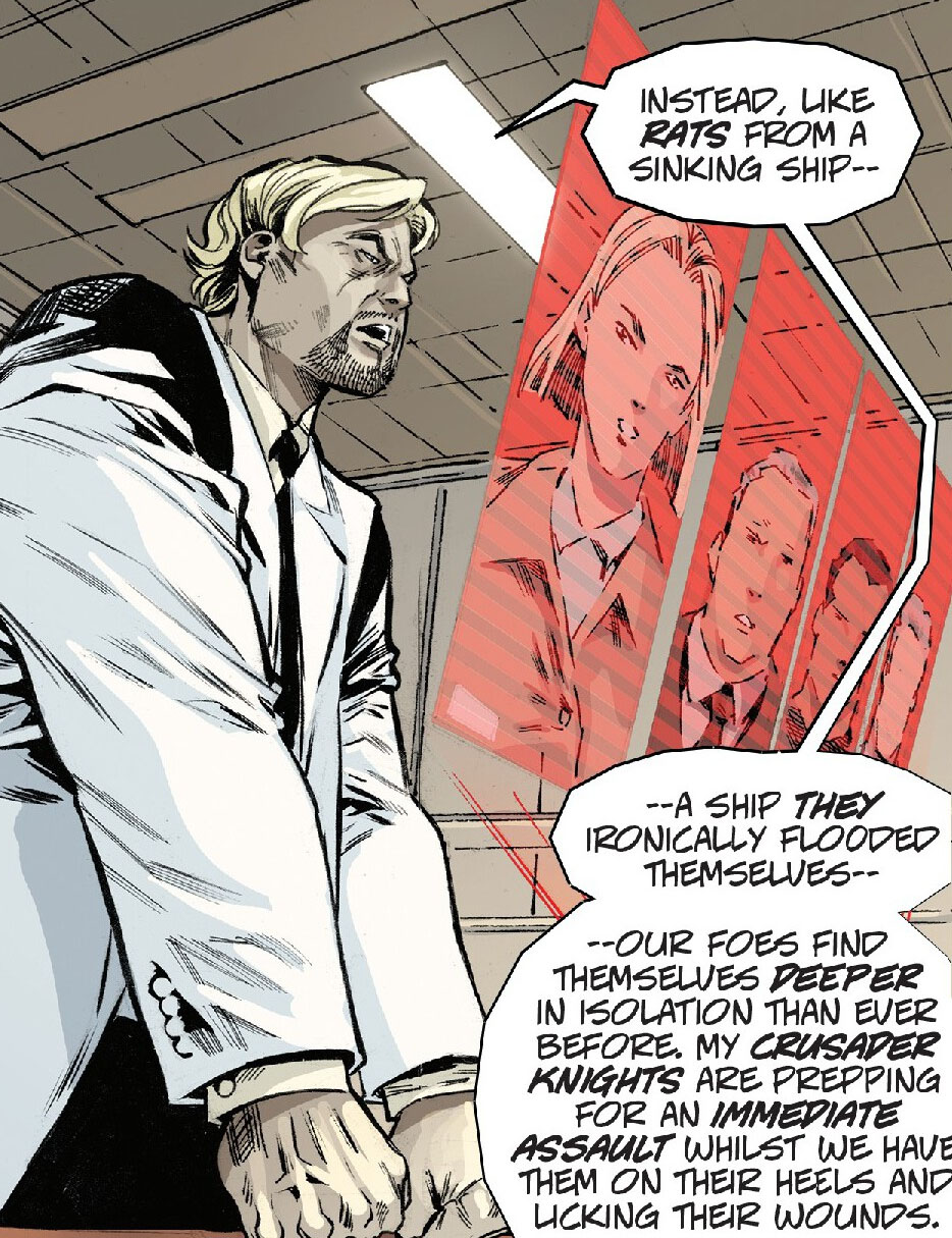 Ainsi, avec ces derniers, ils portèrent un coup décisif à la Résistance en attaquant à la fois leur quartier général et le repaire de Casey Marie. Cette dernière activa avec l’aide d’April le protocole Teddy Bear, les contraignant à se replier sur l’île de Roosevelt Island (The last ronin II #3).