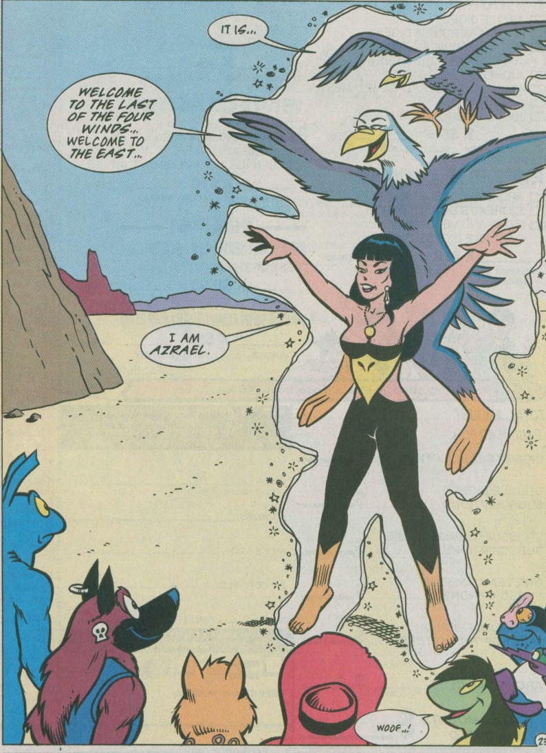 Azrael était une gardienne, veillant au bon déroulement de la Quête des Quatre Vents dans son quart est. Elle se devait de guider ceux qui réalisaient la quatrième épreuve vers la connaissance (Mighty Mutanimals #7). La femme avait la capacité de se changer en pygargue à tête blanche et de veiller sur ceux qui surmontait l’épreuve jusqu’à son accomplissement et la quête de connaissances. Elle garda un œil sur Juntarra, qui se fit enlever par Death. Voyant que la femme courait un grand danger elle partit en avertir l’esprit du Jaguar, qui demanda de l’aide à son fils (Mighty Mutanimals #1).