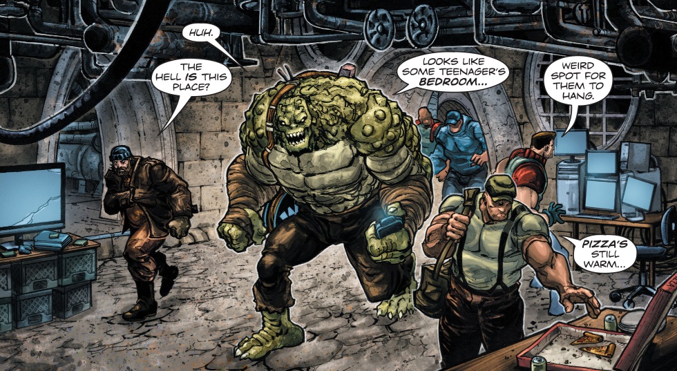S’avançant dans les égouts en direction de leur but, ils trouvèrent une sorte de squat qui semblait occupé par des adolescents. Pizzas et jeux-vidéos trainaient ci et là. Les tortues leur tombaient dessus avant qu’ils n’aient eu le temps de comprendre ce qu’il leur arrivait. Les mutants devaient retrouver la trace du Foot Clan pour espérer rentrer dans leur dimension, si différente de celle-ci.