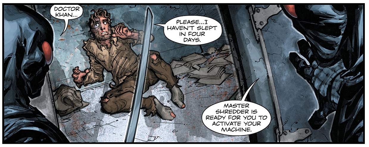Les ninjas Foot amenaient le Dr. Kahn afin de veiller à ce que le premier essai de la machine soit un succès. Mais il craignait qu’en laissant ce portail ouvert, Gotham ne soit endommagée et ne finisse par imploser de par l’instabilité entre les deux mondes. Alors qu’il se levait péniblement de sa cellule après quatre jours de dur labeur, sans dormir, Batman surgit d’un nuage de fumée et neutralisa les ninjas avant de dire au docteur de partir rejoindre le bateau à proximité, où se trouvaient des alliés.