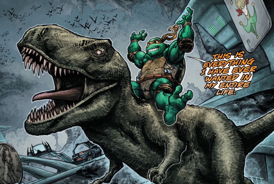 Mais alors qu’il approfondissait ses recherches, l’alarme de la Batcave retentit. Les tortues exploraient cette grotte aménagée. C’était plus fort que lui, Michelangelo devait chevaucher un T-Rex. Donatello s’émerveillait devant le matériel électronique. Raphael n’était pas très enthousiaste à l’idée de s’allier avec Batman. Il ne pensait pas que le justicier puisse avoir la moindre idée de ce qu’était une famille. April, Casey et les autres risquaient leur vie à chaque instant, tant qu’ils ne rentraient pas dans leur monde pour contrer Krang. Batman se trouvait derrière eux et envoya Raphael dans le décor après avoir entendu ses propos. Il voulait savoir ce que faisaient les intrus chez lui. Splinter prit la parole, lui expliquant leur aventure jusqu’à Gotham. Les tortues luttaient contre le Foot Clan à New York. C’est alors que le général Krang, ennemi des deux factions, les envoya tous dans une autre dimension, Gotham, de manière à prendre le contrôle de la Grande Pomme en mettant ses adversaires hors-jeu. C’est pourquoi le temps pressait, et qu’il fallait qu’ils y retournent au plus vite, tant pour aider leurs amis, que pour se sauver eux-mêmes de leur souci génétique. C’est alors qu’Alfred arriva, menaçant les tortues d’un fusil à pompe. Batman le calma avant de se préparer à assiéger le repaire du Pingouin avec ses nouveaux alliés.