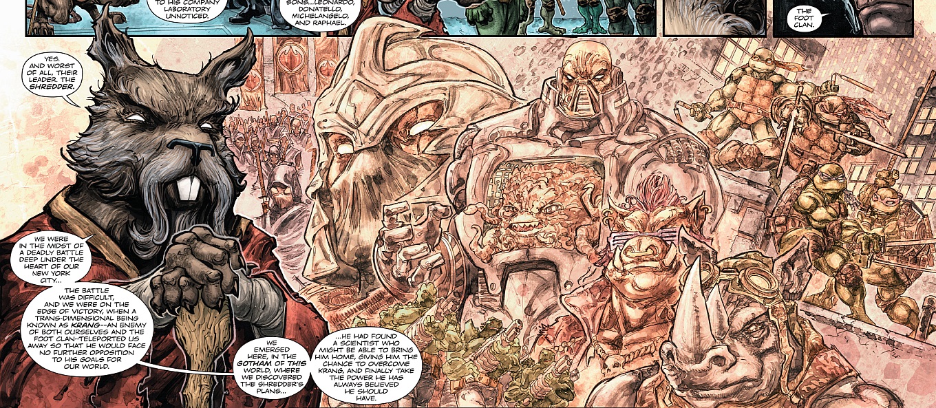 Shredder se trouvait sur l’Iceberg Lounge, regardant au loin la ville de Gotham plongée dans la nuit. Son second venait l’informer que le portail était enfin prêt et que lui et son armée allaient pouvoir rentrer dans leur monde. Mais Shredder avait d’autres plans. Pourquoi seulement se contenter de New York, alors qu’il était à même d’avoir Gotham ? Il comptait laisser le portail ouvert et gouverner sur les deux mondes.