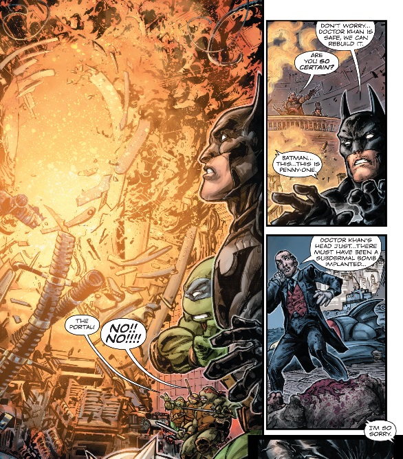Dans la salle principale, la machine était prête à être lancée. Les tortues, Splinter et Batman s’invitèrent à la fête pour contrecarrer le plan de Shredder. Alors que les assaillants gagnaient du terrain, un double coup de théâtre survint. Shredder fit exploser le portail sous les yeux de ses adversaires. Au même moment, Alfred, qui était venu recueillir le Dr. Khan, appelait le justicier pour le prévenir que le rescapé venait littéralement de perdre la tête. Un explosif avait été implanté sous sa peau. Tous accusaient encore le coup.