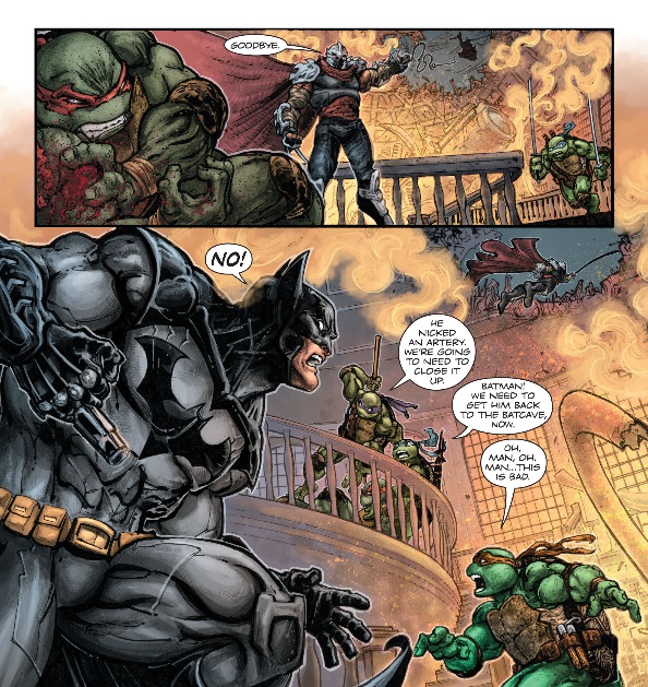 Raphael allait très mal, hors de question de partir à la poursuite de Shredder, il fallait l’emmener à la Batcave pour le soigner.