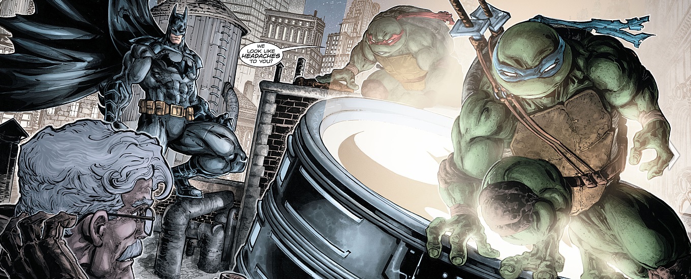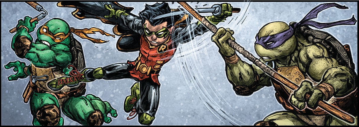 Dans la Batcave, Donatello et Michelangelo s’affrontaient dans Pony Racers, accompagnés de quelques pizzas. Le vainqueur était incontestablement Michelangelo. Casey était consterné, lui qui avait bravé tant de dangers pour rejoindre ses amis et les voir ainsi en train de jouer aux jeux-vidéos. Certes l’écran géant de Bruce était tentant… Mais il voulait réunir au plus vite les quatre frères et leur père. Soudain, une voix jeune les interrompit. Il s’agissait de Robin, qui ne savait pas que Batman avait des invités. Il s’attaqua aux trois intrus les prenant pour des voleurs. Les tortues l’arrêtèrent tant bien que mal. Le chevalier noir arrivait au même moment mettant un terme définitif au combat. Leonardo se trouvait dans ses bras, inconscient.