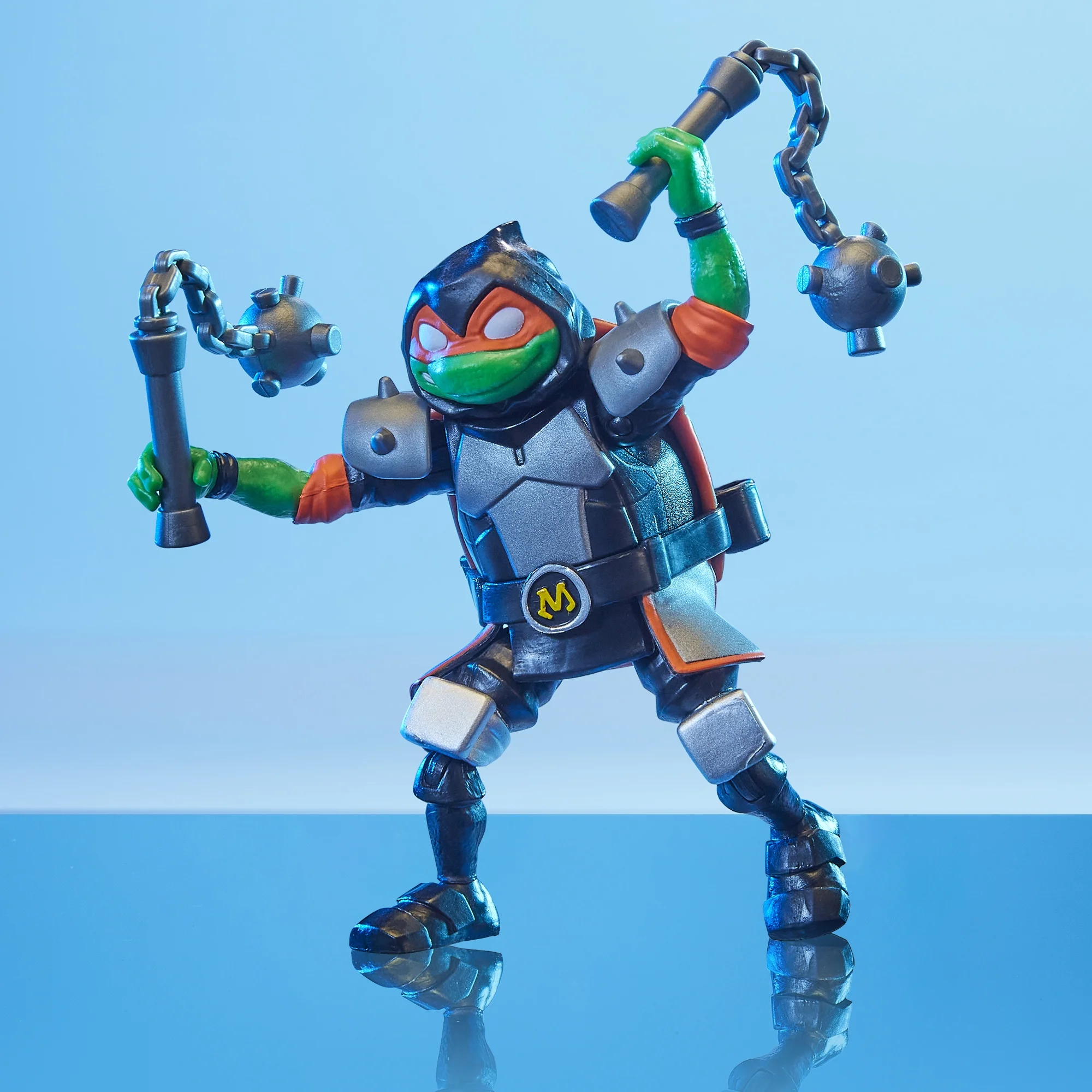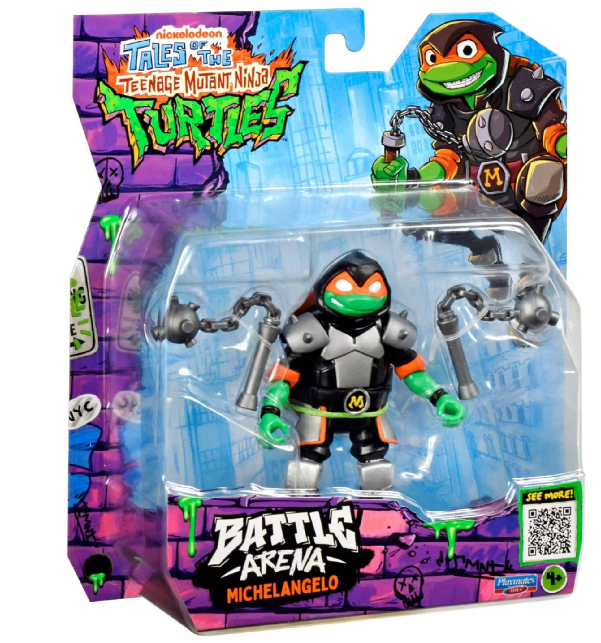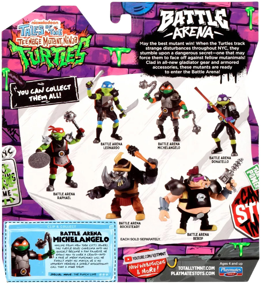 Battle arena Michelangelo fait partie de la quatrième série de figurines Tales of the TMNT, sortie à l’automne 2025. Elle s’inscrit dans la thématique de la deuxième saison de la série. Annoncée dans un premier temps à travers d’un 6-pack, aux côtés de ses frères, de Bebop et de Rocksteady, la figurine est sortie également dans un blister individuel.