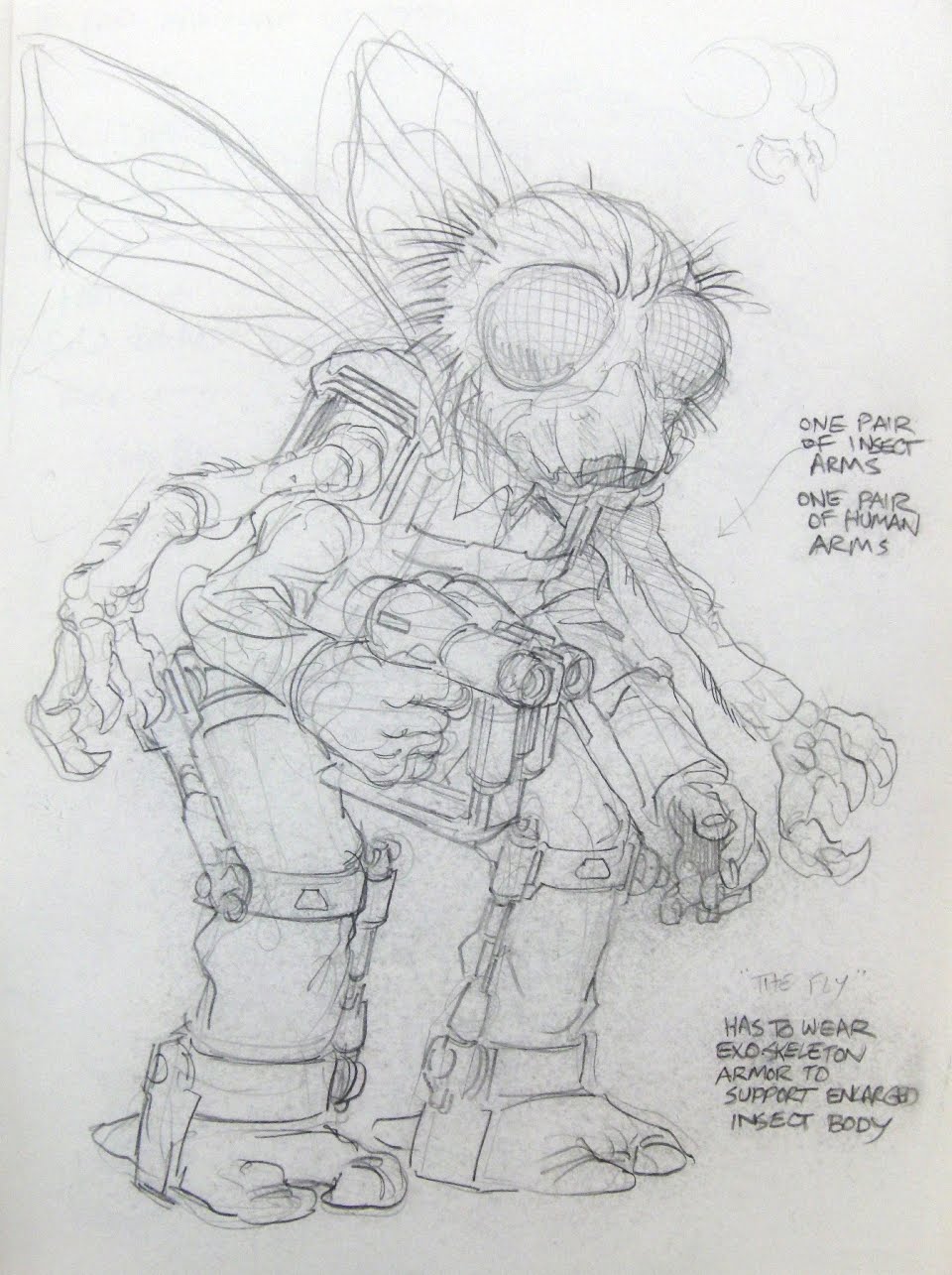- Quand on prête attention aux différents concepts arts créés pour la figurine de Baxter mouche en 1989 (le premier étant apparemment de Peter Laird), il semblerait que Baxter et l’homme mouche étaient deux personnages distincts. Les influences d’une mouche mutante viennent certainement du film La mouche (1986). Son nom par Laird était d’ailleurs « The fly« . Les premiers concept arts de sa figurine, créés par Errol McCarthy le nommaient alors « Fly guy » ou encore « Fly face« . L’étrange accessoire fixé au poignet de la figurine a peut-être été influencé par l’exosquelette que Peter Laird voulait lui donner pour supporter son poids d’insecte mutant surdimensionné.