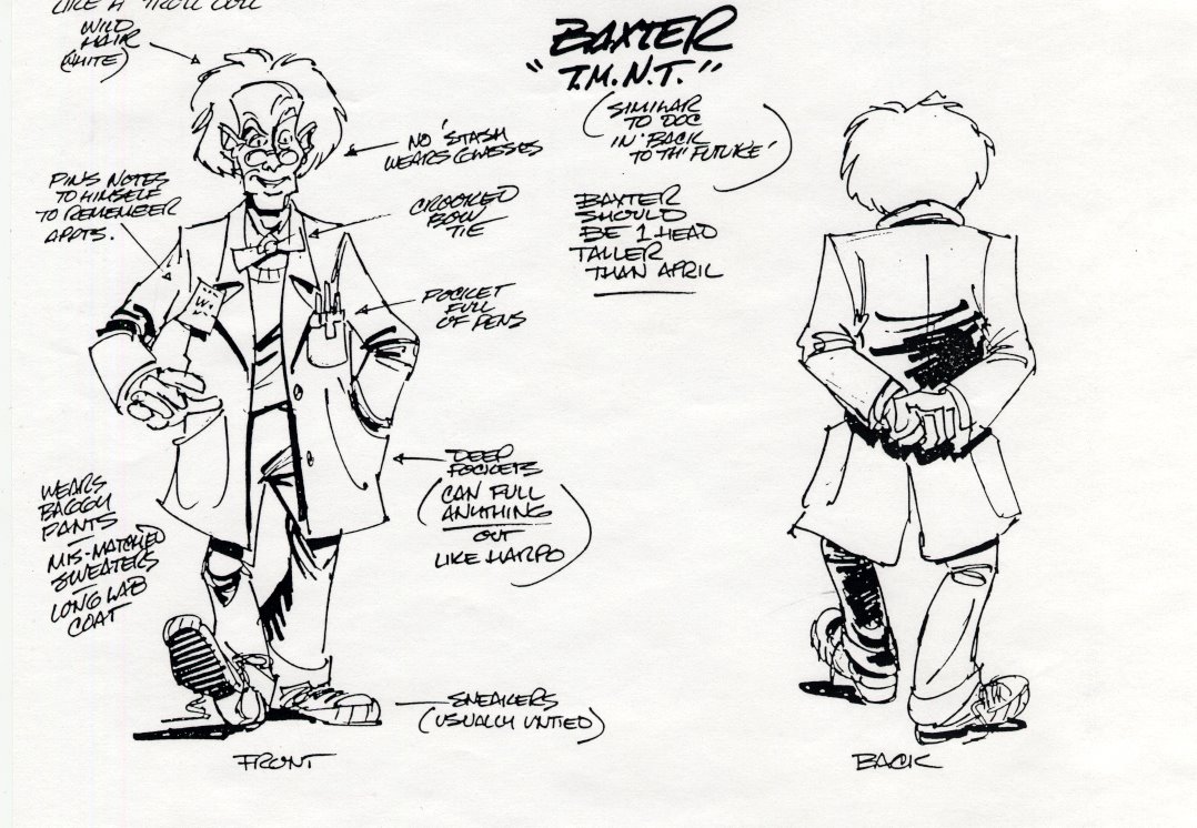 Les concepts arts nous en apprennent beaucoup sur la création et l’évolution du personnage de Baxter Stockman. Les annotations sont des trésors d’informations sur le cheminement qui a mené à la version finale du scientifique.