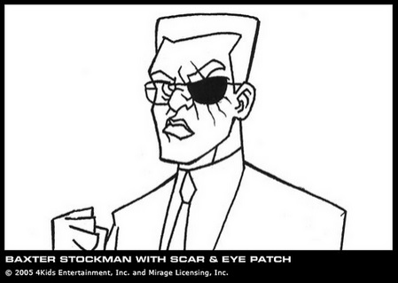 Devenu dans la saison 1 un scientifique de renom à la tête de son laboratoire Stocktronic Corporation, il voulut en apparence consacrer son temps à aider la ville de New York à travers la création de petits robots chasseurs de rats, des Mousers, pour éradiquer la plaie envahissante de la Grande Pomme. Il était alors aidé de son assistante April O’Neil, qui ne tarda pas à découvrir le poteau rose : ses petits robots étaient destinés à voler les banques et semer le chaos. Elle chercha à s’enfuir par les égouts pour révéler le secret aux autorités, mais Baxter envoya les robots à sa poursuite. Arrivée à un cul de sac, les Mousers s’approchèrent d’elle (Un nouveau piège à rat, S1 E2). Alors qu’ils s’apprêtaient à la manger, les tortues arrivèrent et sauvèrent April, qui ne tarda pas à devenir une de leur plus fidèle alliée. Elle aida les tortues à retourner à Stocktronics pour arrêter la folie de Baxter et également venger leur ancienne demeure, ravagée au cours du premier épisode par les Mousers (Le déménagement, S1 E1). Les tortues durent affronter les robots mangeurs de rats que le scientifique envoya pour prendre la fuite. Si son immeuble s’effondra suite à une explosion, Baxter survécu et fut envoyé par Hun chez Oroku Saki pour lui donner des explications. Cet échec lui valut sa première mutilation par Hun : son œil gauche lui fut arraché (L’attaque des dératiseurs, S1 E3).