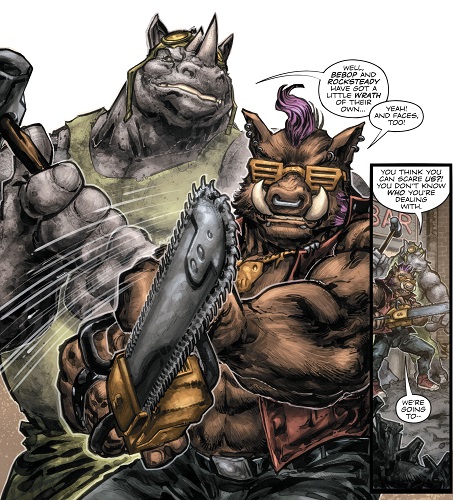 Bebop était un phacochère mutant, toujours accompagné de son acolyte Rocksteady. À la botte du Foot Clan, ils cherchaient à se rallier au plus fort à la moindre occasion. Après l’emprisonnement de Shredder (Batman / TMNT I, part. 6), ils se joignirent à Bane, qui venait marcher sur New York et voulait prendre le contrôle du Foot Clan (Batman / TMNT II, part. 2).
