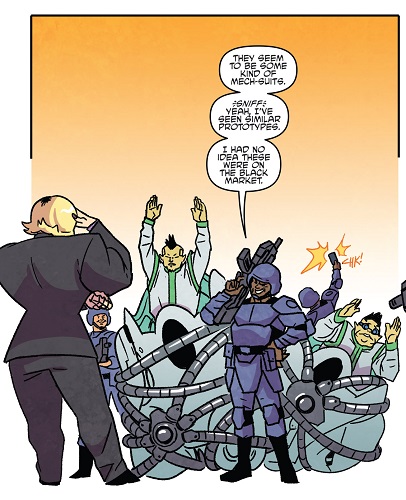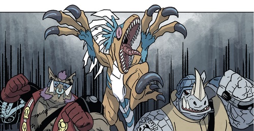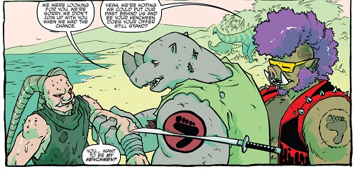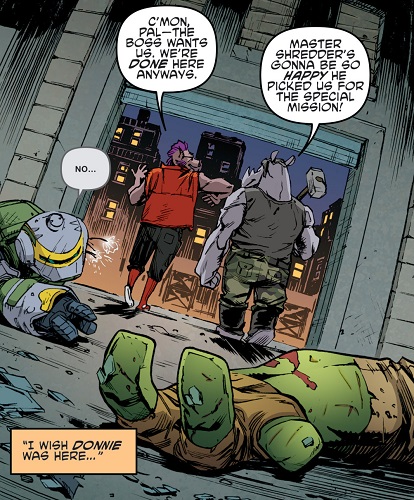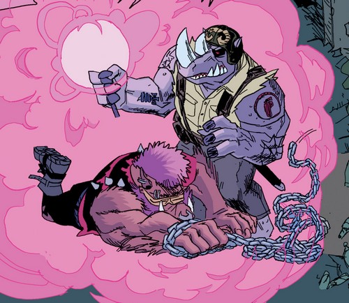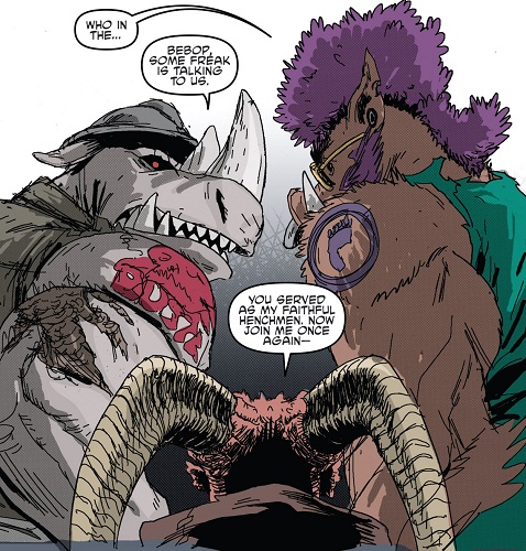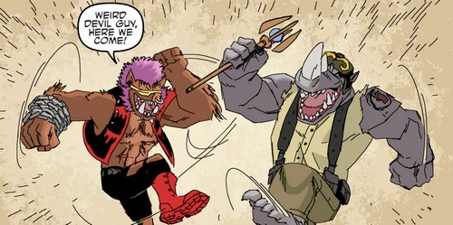 Shredder savait qu’il ne pouvait compter sur les deux brutes que pour des opérations qui ne demandaient pas de tact. Donatello vint à lui afin de lui proposer un marché et d’attaquer Burnow Island, d’où Krang s’apprêtait à lancer la terraformation de la planète à l’aide de son Technodrome (TMNT #41). Méfiant, Shredder accepta mais plaça ses deux mutants à la surveillance du laboratoire d’Harold Lillja, depuis lequel Donatello supervisait l’assaut. Il fit passer le Foot Clan par le portail interdimensionnel qu’il avait créé. À la moindre impression de trahison, Shredder ordonnerait son exécution par Bebop et Rocksteady. Sur le champ de bataille tout ne se passa pas comme prévu, et ce dernier comprit la supercherie (TMNT #43). Il ordonna à ses mutants d’exécuter Donatello, qui reçut un très violent coup de maillet dans la carapace (TMNT #44).