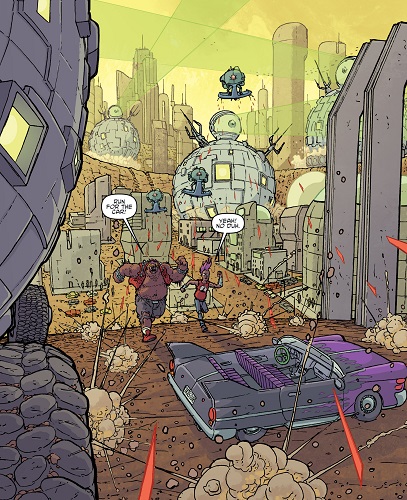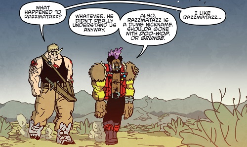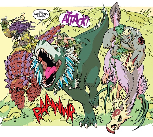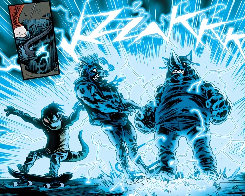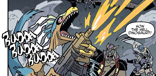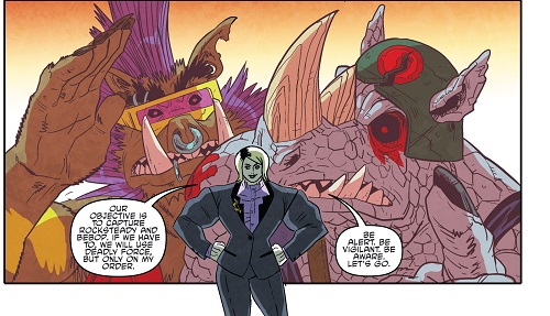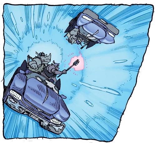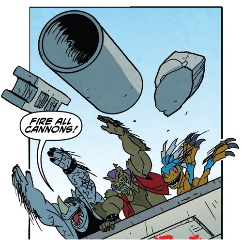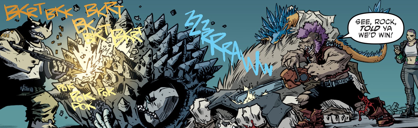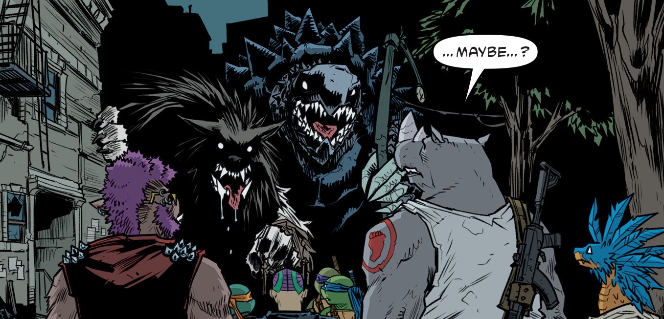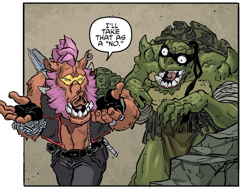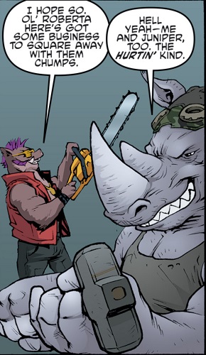 Reprenant leur route, ils trouvèrent les tortues et affrontèrent Tokka et Rahzar. Le phacochère usa de sa tronçonneuse pour prendre l’avantage sur les deux mutants. Afin de les arrêter, Donatello eut l’idée de se servir de son téléphone pour demander une visio à Karai afin d’apaiser les deux jeunes mutants qui réclamaient leur mère. Mais le téléphone fut saisit par Natsu. Lita et Jennika, pour attirer l’attention des deux brutes, leur proposèrent un duel de musique. S’ils perdaient, Bebop et Rocksteady quitteraient Mutant Town. S’ils gagnaient, ils remportaient le Kennel Klub. Jennika était sûre de sortir victorieuse de ce duel contre ces amateurs. Leonardo reprit le téléphone, permettant de calmer Tokka et Rahzar (TMNT (Vol. 5) #115).