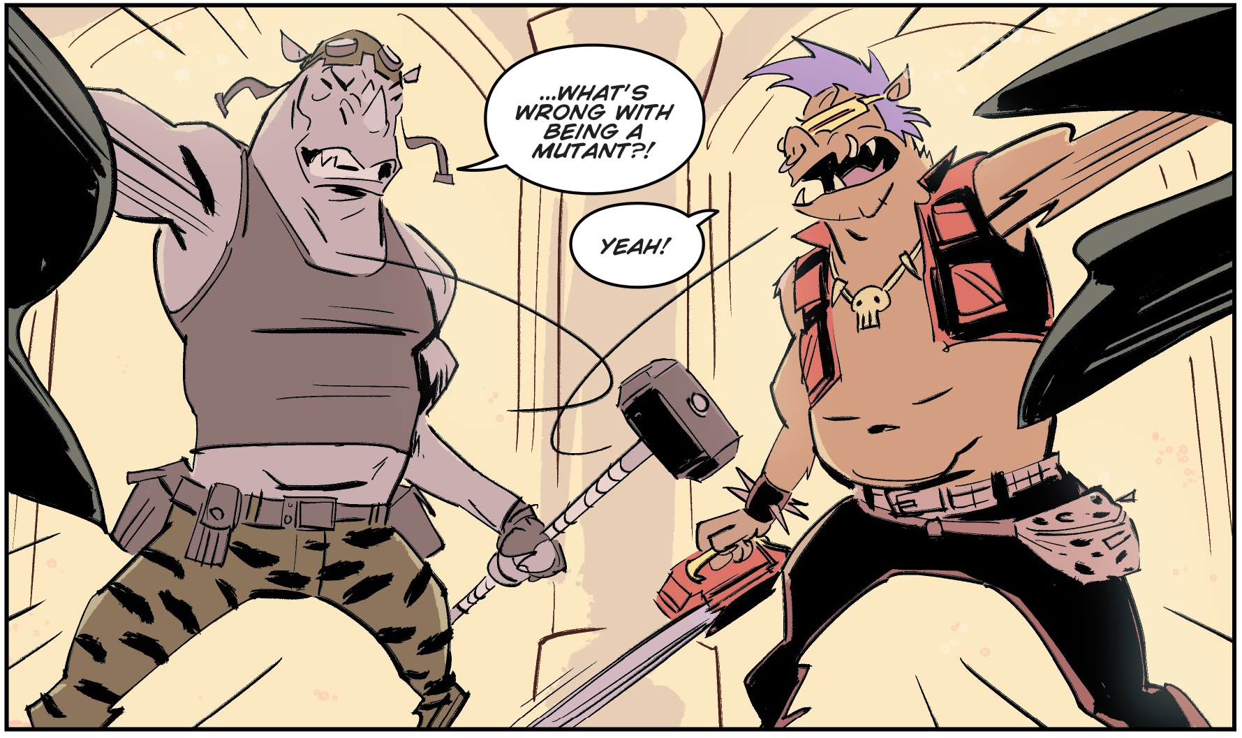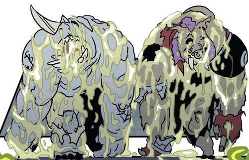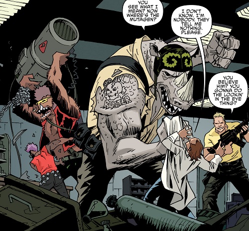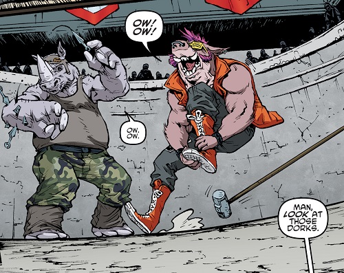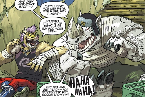 L’efficacité des deux mutants permit au Foot Clan d’attaquer de nombreuses banques, avec l’aide également de Hun (TMNT #33). Un jour, alors que Bebop et Rocksteady se promenaient dans la ville, ils croisèrent la route de Pigeon Pete, qui leur proposa de rejoindre les Mighty Mutanimals. Ils savaient qu’ils pourraient y retrouver les tortues et acceptèrent de le suivre (TMNT #38). Cela les mena à Hob et ses mutants, ainsi que Splinter et ses tortues (TMNT #39). Un très rude combat s’engagea et ce ne fut qu’avec l’entraide des mutants qu’ils réussirent à retourner la situation. Herman tira avec son armement lourd sur eux, et un immeuble désaffecté s’effondra sur eux. Si tous les croyaient morts, ils se relevèrent après avoir repris connaissance, quelques minutes plus tard (TMNT #40).