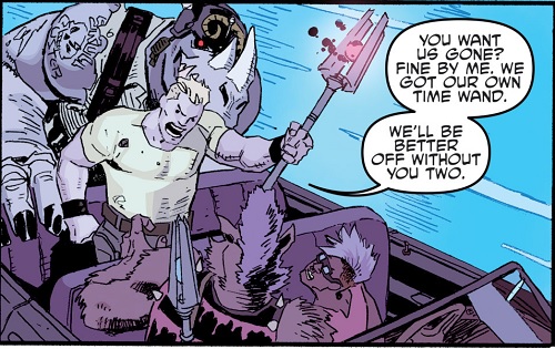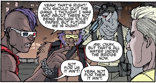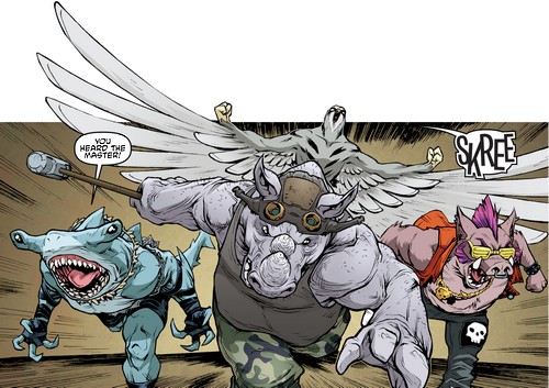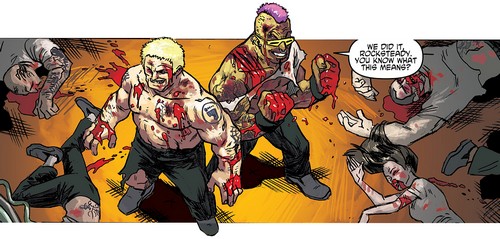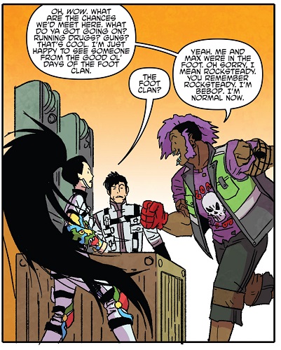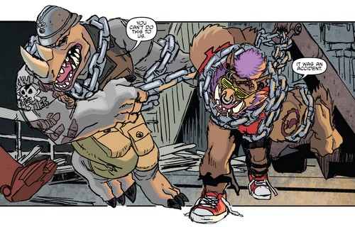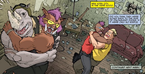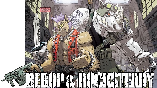 Après la chute du Foot Clan de Shredder, les deux mutants furent chassés. Ils se réfugièrent à Rio de Janeiro, prenant le Brésil pour l’Afrique. Là, ils cherchèrent un nouveau gang où se faire accepter. Une fois encore, ils furent rejetés. Repartant chez eux, Rocksteady se souvint d’un étrange sceptre qu’ils avaient subtilisé à une petite créature à cornes, la semaine précédente. Peut-être qu’en s’excusant, ils pourraient rejoindre son gang se disaient-ils ? Le sceptre était celui du temps, dérobé par Savanti Romero à Renet. Ils disparurent dans les couloirs du temps, en direction de New York, au début des années 2000 (Bebop & Rocksteady destroy everything #1). Là, ils retrouvèrent leur version plus jeune de 15 ans et partirent à l’aventure (Bebop & Rocksteady destroy everything #2).