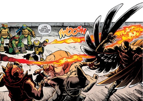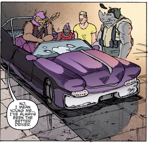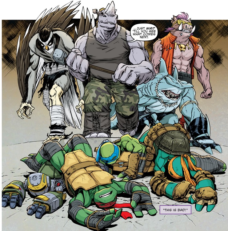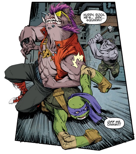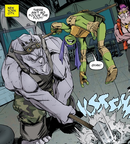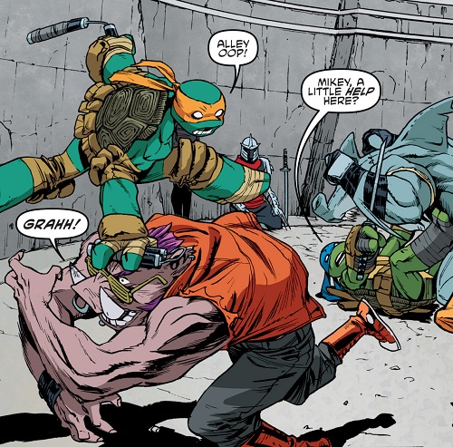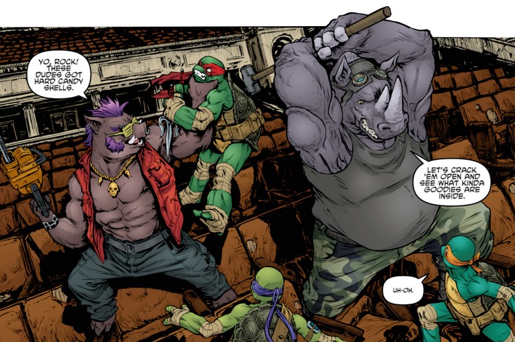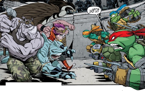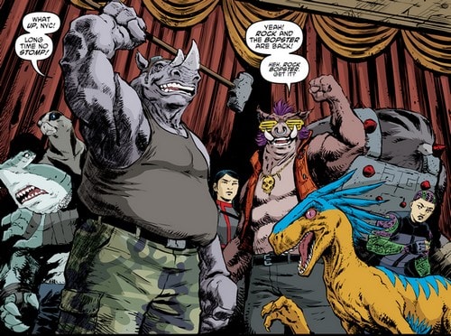 Les tortues, aidées d’Old Hob et de la technologie d’Harold Lillja sabotèrent la démonstration de force de Shedder devant la pègre new yorkaise dans le vieux théâtre. Sens dessus dessous, les armées du Foot Clan étaient désorientées par l’attaque surprise. Karai arriva avec ses deux mutants afin de prêter main forte à Shredder. Elle ne pouvait rêver d’une meilleure occasion pour redorer son blason et démontrer à son supérieur sa valeur (TMNT #27). Les tortues eurent fort à faire contre Bebop et Rocksteady, aussi grands que puissants. Bebop était alors armé d’une tronçonneuse, Roberta. Inarrêtables, les tortues s’empressèrent de prendre Leonardo avec elles et de filer à bord du véhicule d’Old Hob. Le chat lança une grenade par la fenêtre pour ralentir les deux brutes et s’enfuir.