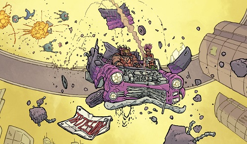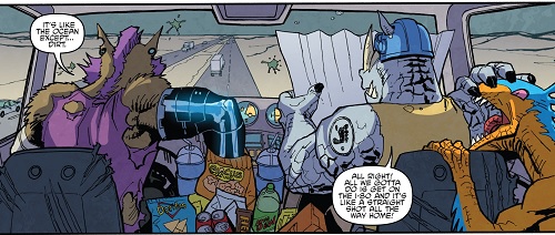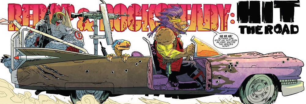 Les mois passèrent et le duo décida qu’il était temps de rentrer à New York, qui leur manquait beaucoup. Ils traversèrent le désert du Mexique, où une curieuse aventure leur arriva : L’oreille droite de Rocksteady était redevenue humaine ! Le rhinocéros, de peur que la maladie ne se propage, se la coupa. Las d’être considérés comme des monstres, voyant qu’aucun gang ne voulait d’eux, Bebop proposa à son ami de devenir de bons individus, des super-héros comme les Tortues Ninja. Si l’idée paraissait saugrenue pour le rhinocéros, il accepta. Reprenant leur route, ils firent la connaissance d’un U-tuber du surnaturel, Hector Barrales, avec qui ils firent un petit peu de route. L’homme leur parla d’une étrange créature qui terrorisait la région. C’était l’occasion rêvée pour le duo de devenir des héros et acceptèrent de l’aider. Ils furent alors très vite attaqués par le monstre, qui n’était autre que Wingnut et Screwloose. Rocksteady fut emmené dans la tour que les deux mutants avaient érigée pour essayer de contacter les leurs. Bebop arriva avec leur voiture pour le délivrer et la jeta sur la chauve-souris, la précipitant dans un ravin. Un nouveau gros problème se présentait à eux : nombre de leurs membres étaient redevenus humains. Reprenant leur route, ils avaient bientôt retrouvé leur entière apparence pré-mutation (Bebop & Rocksteady hit the road, part. 1).