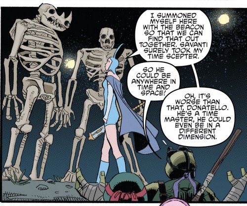 Là, Savanti Romero leur apparut et leur proposa de les soigner en échange d’un petit coup de main contre le Maîtres du temps qu’il voulait détruire. Ils acceptèrent et retrouvèrent pour une durée limitée leur apparence de mutants. Ils embarquèrent avec Romero dans son vaisseau au moment où la flotte de la police des Maîtres du temps arrivait à Houston. Faisant comme à leur habitude n’importe quoi, le duo sema le chaos dans la ville mais ne firent rien contre leurs ennemis. Romero fut capturé et les Maîtres du temps découvrirent que Bebop et Rocksteady avaient perdus leur apparence mutante à cause d’une bulle de régression temporelle de huit ans. En réalité, Savanti Romero avait tout organisé depuis le début. Ils firent en sorte que les choses rentrent dans l’ordre avant de les renvoyer dans l’univers Bopsteady. Mais à peine avaient-ils eu le temps de leur rendre l’apparence mutante qu’Anchovy, qui suivait le duo depuis le Brésil, se jeta sur eux et les dévora. Ils purent repartir tous les trois à bord d’un vaisseau des Maîtres du temps (Bebop & Rocksteady hit the road, part. 3).
