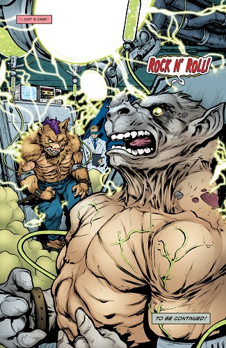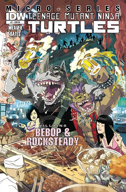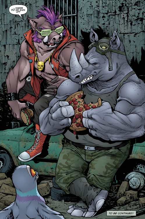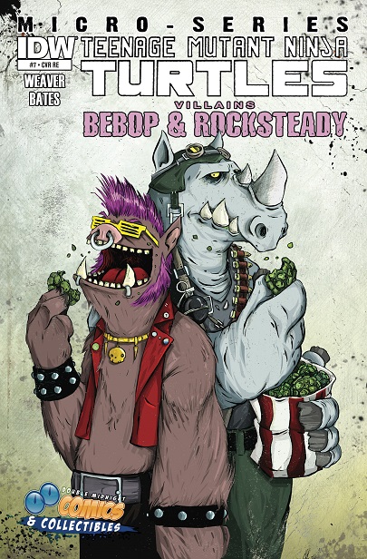 - Ben Bates, qui a réalisé le Villains Micro-Series #7 : Bebop & Rocksteady nous apporte quelques détails intéressants sur la taille des personnages, dont Bebop, qui fait environ 185 cm sans son mohawk. Il précise également que ses tatouages disparaissent sous son poil, bien qu’ils demeurent toujours présents. Dans le Bebop & Rocksteady hit the road, part. 4, son casier judiciaire nous le présente faisant 180 cm.