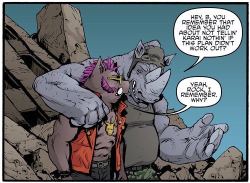 Là, les ninjas Foot et Karai les retrouvèrent et essayèrent de les tuer. Bebop et Rocksteady étaient presque invulnérables. Seule Karai parvint à leur montrer qu’ils n’étaient pas totalement invincibles. Voyant qu’ils étaient tous deux prêts à continuer au sein du clan si la chance leur était offerte, elle accepta de les garder. S’ils étaient stupides, leur force était un atout indéniable, tant pour le clan que pour la jeune femme (TMNT Villains Micro-Series #7 : Bebop & Rocksteady).