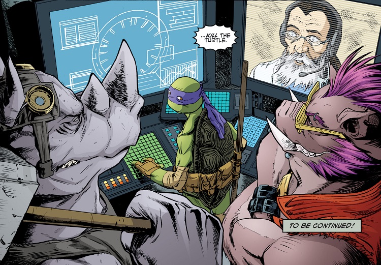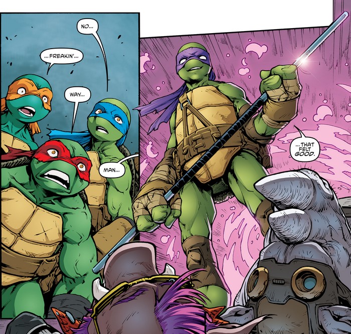 La tortue fut secourue à temps et soignée. Dans l’attente de son rétablissement, son esprit fut transféré dans le corps de Metalhead. Après avoir essuyé un assaut des Flyborgs et Mousers de Baxter dans les égouts, les tortues furent sauvées par Karai et son Foot Clan. Elle leur proposa de rencontrer Shredder et d’achever leur combat, qui durait déjà depuis quatre siècles. Le combat se déroulerait en deux manches. Dans la première, les élèves des deux maîtres, Shredder et Splinter, s’affronteraient. D’un côté, Bludgeon, Koya, Bebop et Rocksteady. De l’autre les trois tortues et Metalhead (TMNT #49). Le combat était désespéré, mais arriva à temps le véritable Donatello, guérit, qui fit exploser le corps du robot et put ainsi neutraliser Bebop et Rocksteady, toujours sur pieds (TMNT #50).