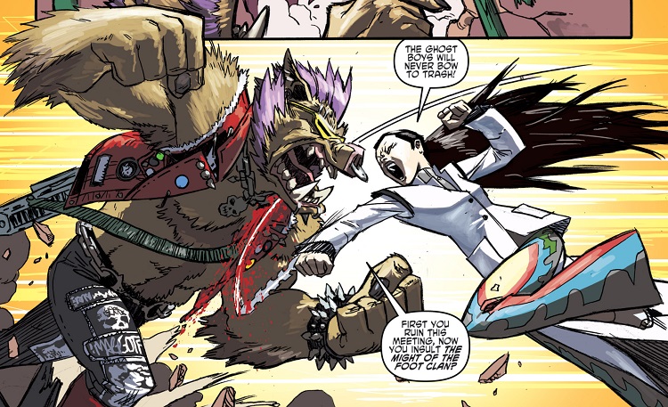 Avant de pouvoir réellement travailler pour le Foot Clan, il eut une mission d’escorte avec Rocksteady afin de prouver sa valeur. Ils devaient impressionner les Ghost Boys que Karai venait voir pour traiter d’une future réunion engagée avec Shredder. Mais leur stupidité fit capoter le plan de la chunin et les Ghost Boys furent accidentellement tués par les deux brutes qui avaient totalement perdues le contrôle de la situation. Pensant avoir même tué Karai dans le combat, ils partirent se réfugier sur les quais de la gare de fret.
