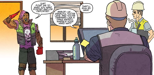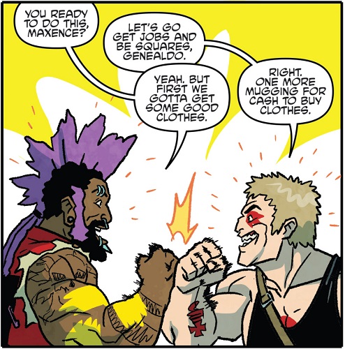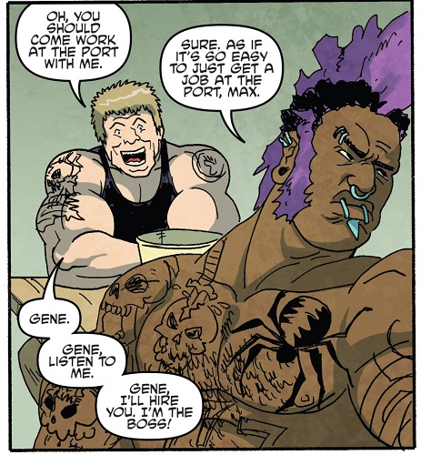 Un travail et une famille. Ils abandonnèrent leurs surnoms pour se faire appeler de nouveau Genealdo et Maxence et commencèrent à chercher du travail, ce qui fut très rapidement un échec. Un soir, Genealdo apprit que Maxence avait conservé son travail et qu’il était surtout à la tête de la gestion du port de Houston. Ce dernier lui proposa de le rejoindre le lendemain et il essaierait de lui faire gravir les échelons. C’est alors que Genealdo, qui refusait de porter un casque de chantier, rencontra Xiang Fei Tong, cheffe des Ghost Boys et l’une des rares survivantes de leur bourde passée (TMNT Villains Micro-Series #7 : Bebop & Rocksteady). Reconnaissant les deux imbéciles, elle lança une attaque sur eux. Se défendant, ils virent l’adrénaline remonter dans leurs veines et décidèrent de reprendre la route du crime, qu’ils ne pouvaient quitter. Hélas, ils n’avaient plus la force d’antan et Bebop fut projeté dans un hangar. Le bras cassé, il fut criblé de balles et jeté dans une poubelle avec son ami (Bebop & Rocksteady hit the road, part. 2).