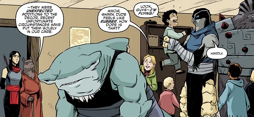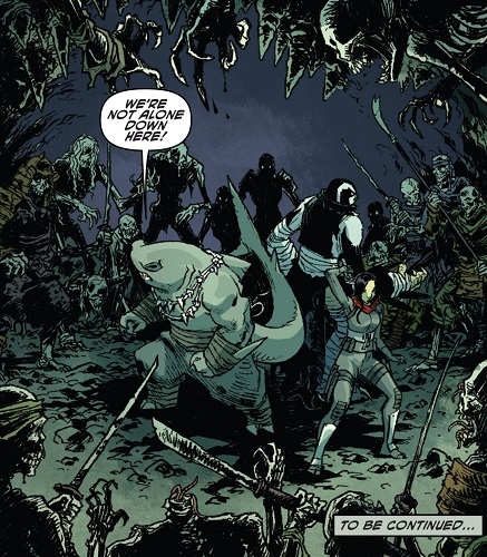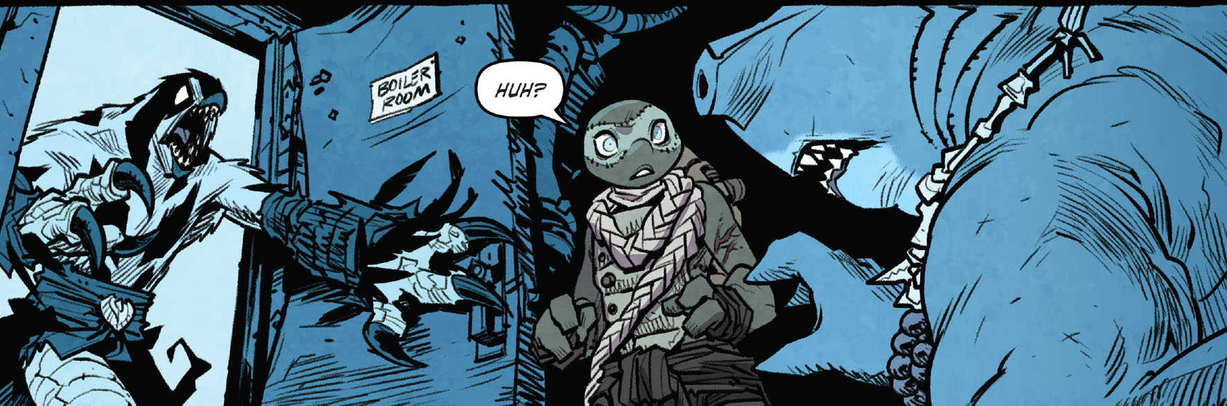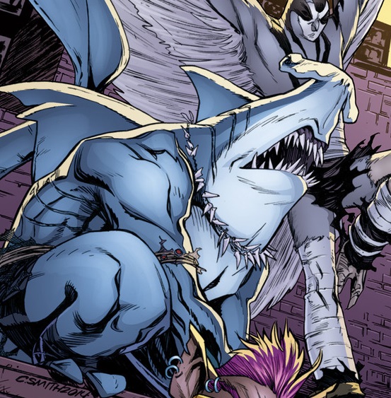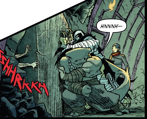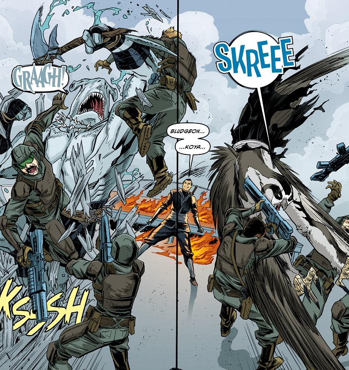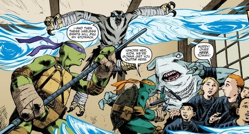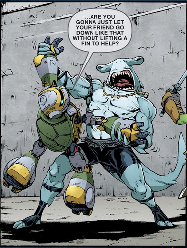 À cette époque, les deux mutants qui l’accompagnaient avaient beaucoup de mal à se remettre de leurs blessures, surtout Koya qui n’acceptait pas de ne plus voler. Ils étaient tous trois entraînés régulièrement par Toshiro, grand maître des arts martiaux et formateur des ninjas du Foot Clan. Bludgeon était le plus serein. S’il avait perdu la vue, il parvenait à développer de nouveaux ses sens. Il ne voyait plus à proprement parler, mais sentait les présences et son odorat était sans pareil (TMNT Universe #12). Lorsqu’ils partirent pour Hokkaido à la recherche de l’épée des dieux Kira no Ken dans la cachette de Tatsuo, ils entrèrent dans une grotte et furent très rapidement encerclés par des morts vivants (TMNT Universe #13). La règle de ce défi était simple. Les morts les provoquaient, ils ne devaient pas répondre. Le sens de la répartie de Bludgeon lui permit de ne pas rentrer dans la provocation, mais Koya massacra l’un des cadavres. Sans attendre, le requin qui venait d’ouvrir une porte monolithique sauva le faucon et Karai face aux hordes de morts vivants qui essayaient de les tuer. Finalement dans la pièce du trésor, il aida Karai à dérober l’épée des dieux face à la gardienne Ocho (TMNT Universe #14).