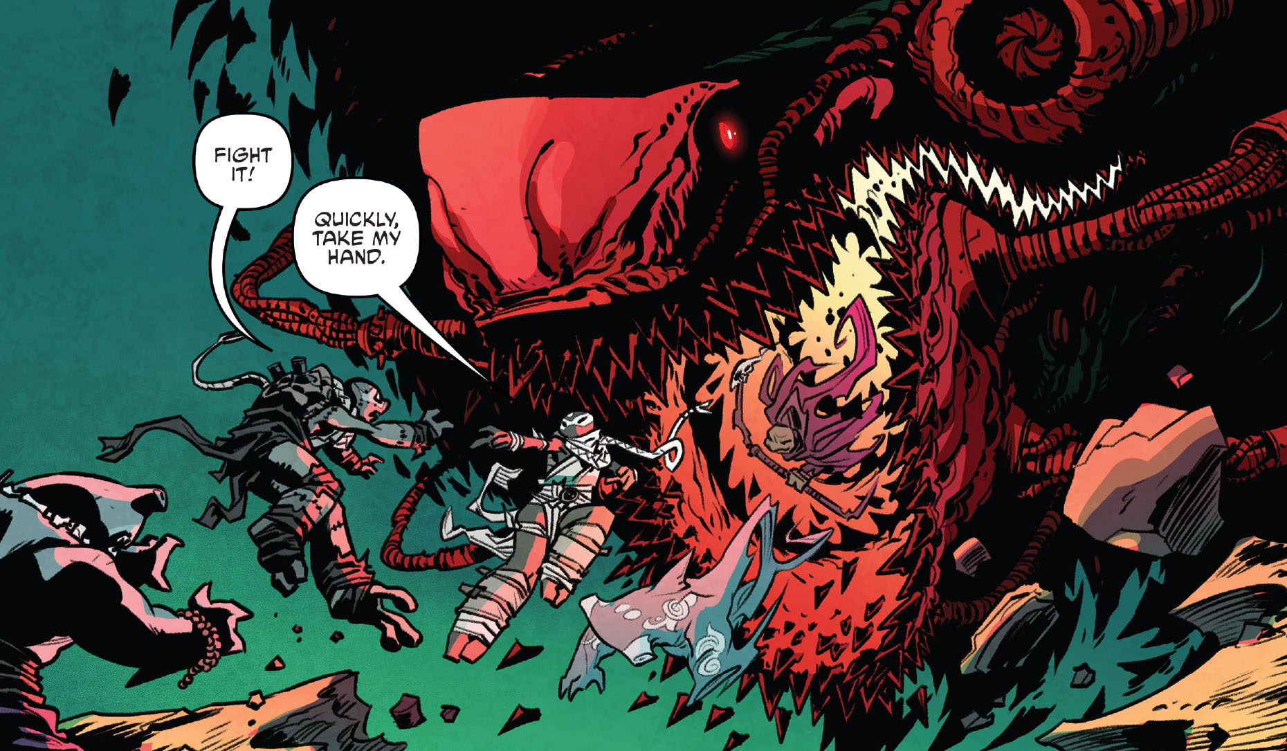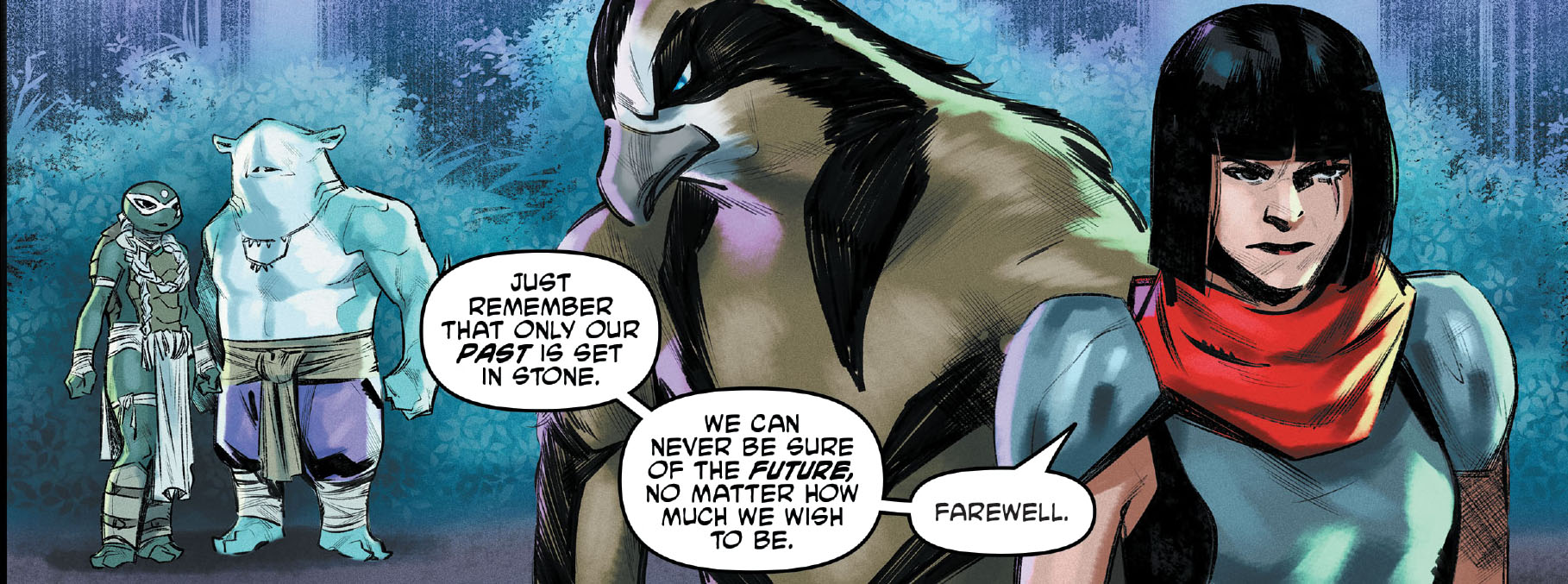 Ce dernier combat avait été extrêmement éprouvant pour la petite-fille de Shredder, qui venait de perdre à la fois son clan et son grand-père, mais aussi pour Koya qui avait perdu ses ailes et Bludgeon devenu aveugle.