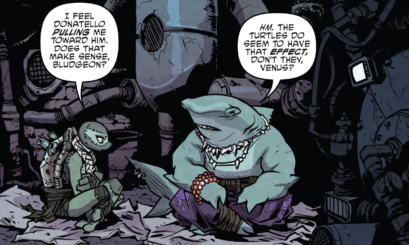 Il recueillit la pauvre Venus, totalement perdue dans ce nouveau monde de mutants (TMNT #130). Il voulait qu’elle trouve enfin sa destinée. Le requin l’aida notamment à méditer pour trouver son rôle dans ce nouvel univers en la cachant dans la chaufferie du quartier général du Foot Clan. Mais la créature hybride avait beaucoup de questions, surtout à propos de son lien spirituel avec Donatello. Bludgeon n’avait aucune réponse à ses questions. Ils furent tous deux transportés mystérieusement dans le futur. Ils s’y virent, au sein d’un groupe soudé, en train de se préparer à un grand évènement. Bludgeon semblait enfin serein et satisfait au sein de ce groupe. C’est alors qu’un Donatello âgé arriva pour mettre un terme à leur entraînement. Leur moment était venu. Le ciel s’assombrit et Armaggon sortit des nuages pour avaler les disciples. Venus et Bludgeon essayèrent d’intervenir, en vain. Le sage Bludgeon, version du futur, leur demandait de rester sains et saufs. Ils étaient l’avenir de leur réalité. Ils retournèrent avec l’aide de Donatello dans leur présent.