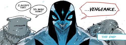 Par cette attaque, le requin était réellement devenu aveugle. Après la défaite d’Oroku Saki au cours du duel final contre Splinter, Karai partit avec les hommes qu’elle désirait pour le Japon. Elle choisit Koya et Bludgeon, tous deux fortement blessés par leur combat récent, pour la suivre (TMNT #50).