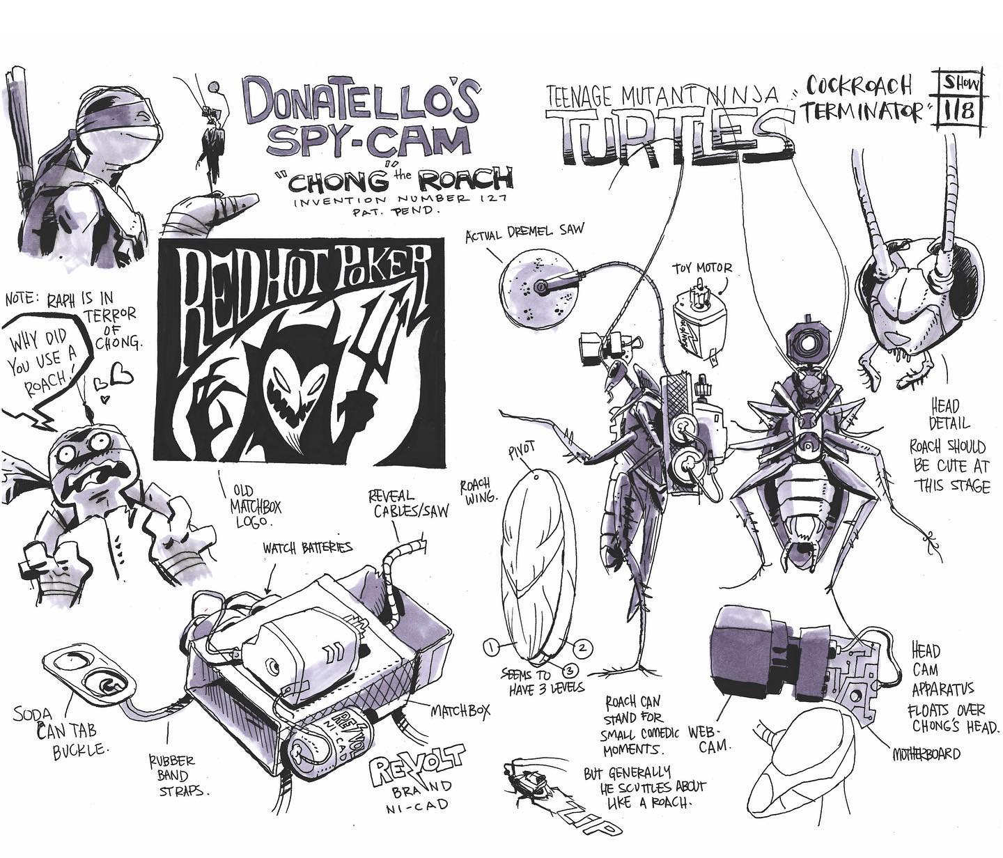- À aucun moment dans l’épisode Le cafard Terminator (S1 E18) Donatello ne mentionne le nom de son cafard, Chong. Il provient des concepts arts du personnage, réalisés par Chong Suk Lee. C’est donc l’artiste qui lui a donné ce nom !