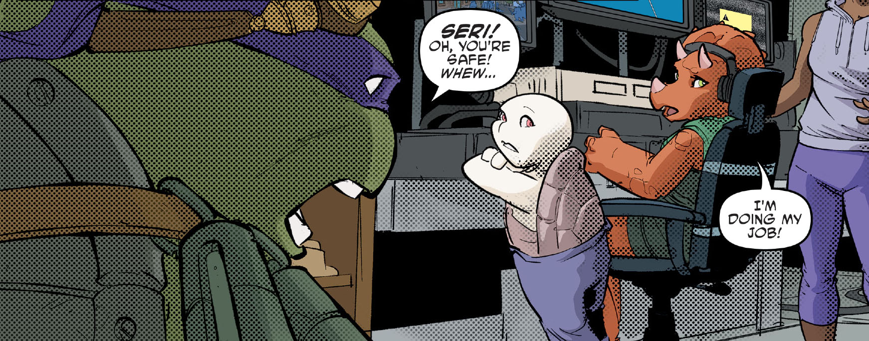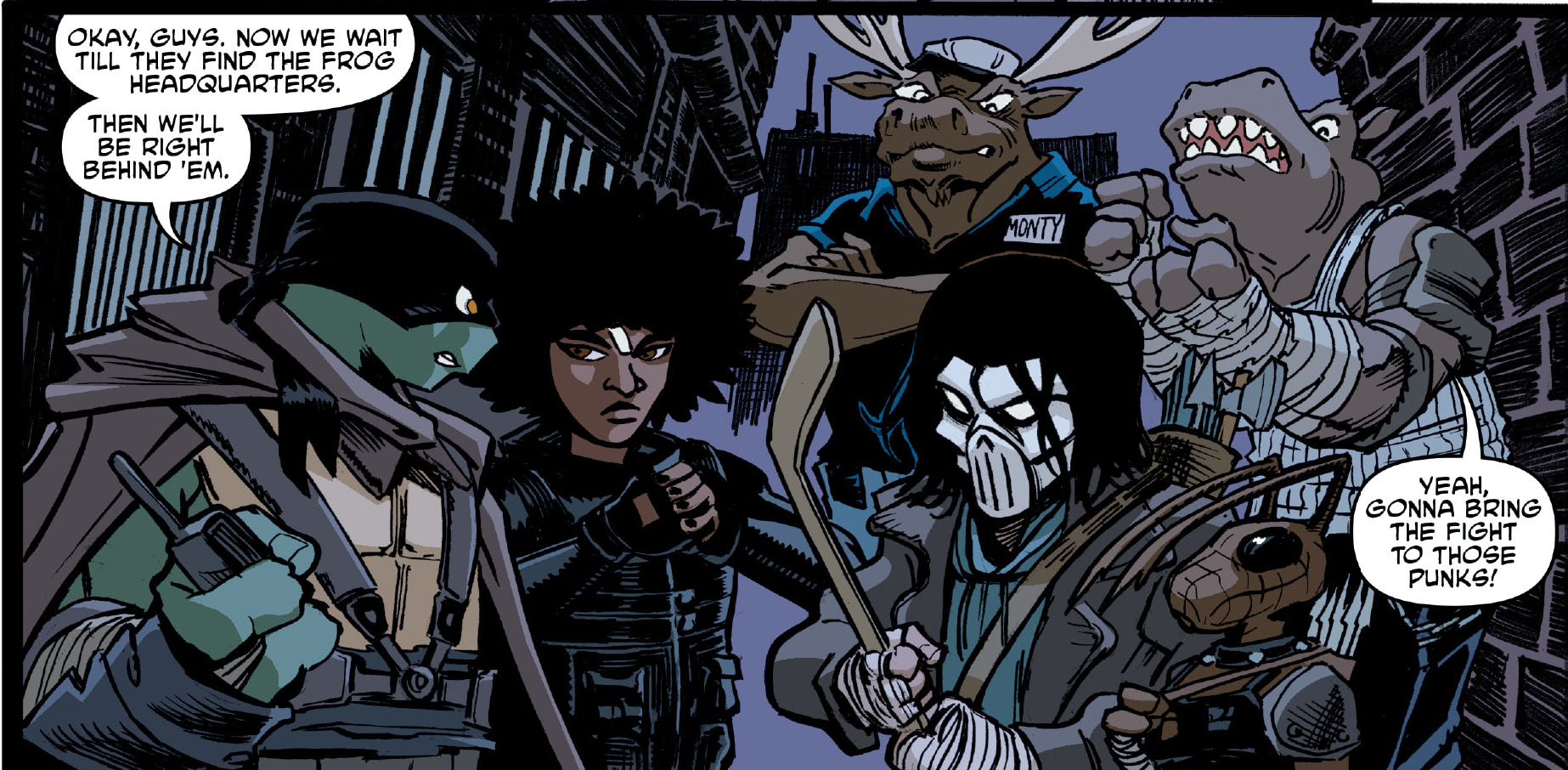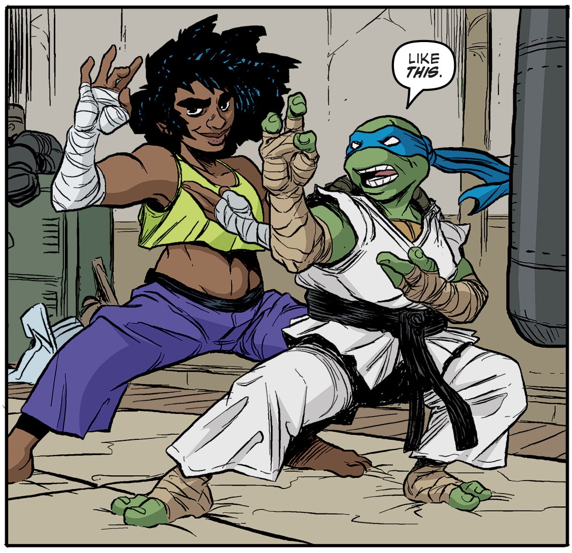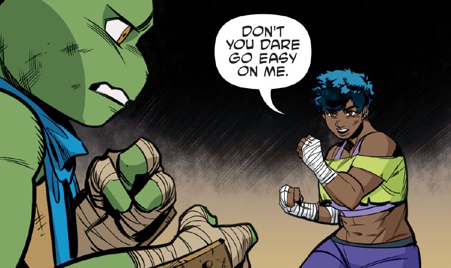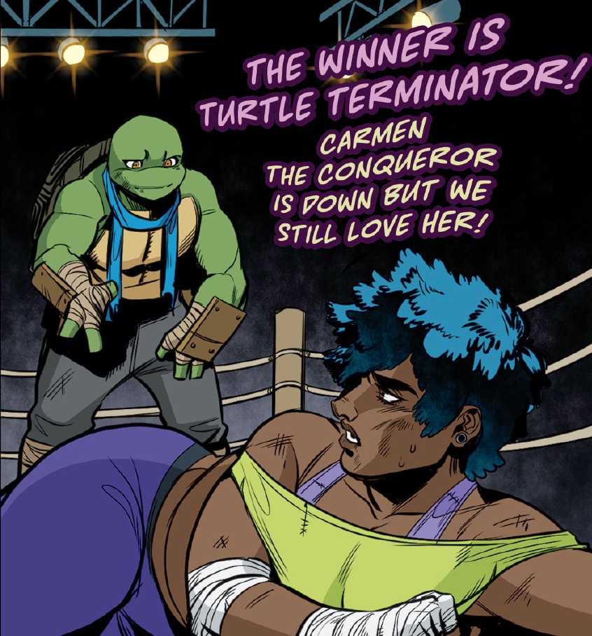 Elle est parvenue à entrer illégalement dans Mutant Town pour livrer des combats dans un fight club. Leonardo fut convié à se battre dans cette arène par Casey et Sheena. Tentée par l’opportunité, la tortue monta sur le ring et dut faire face à Carmen. Le ninja avait déjà entendu son nom de la bouche de Lita. L’apprentie maîtresse du temps lui avait recommandé de veiller sur elle lorsqu’il la rencontrerait et de la former au combat.
