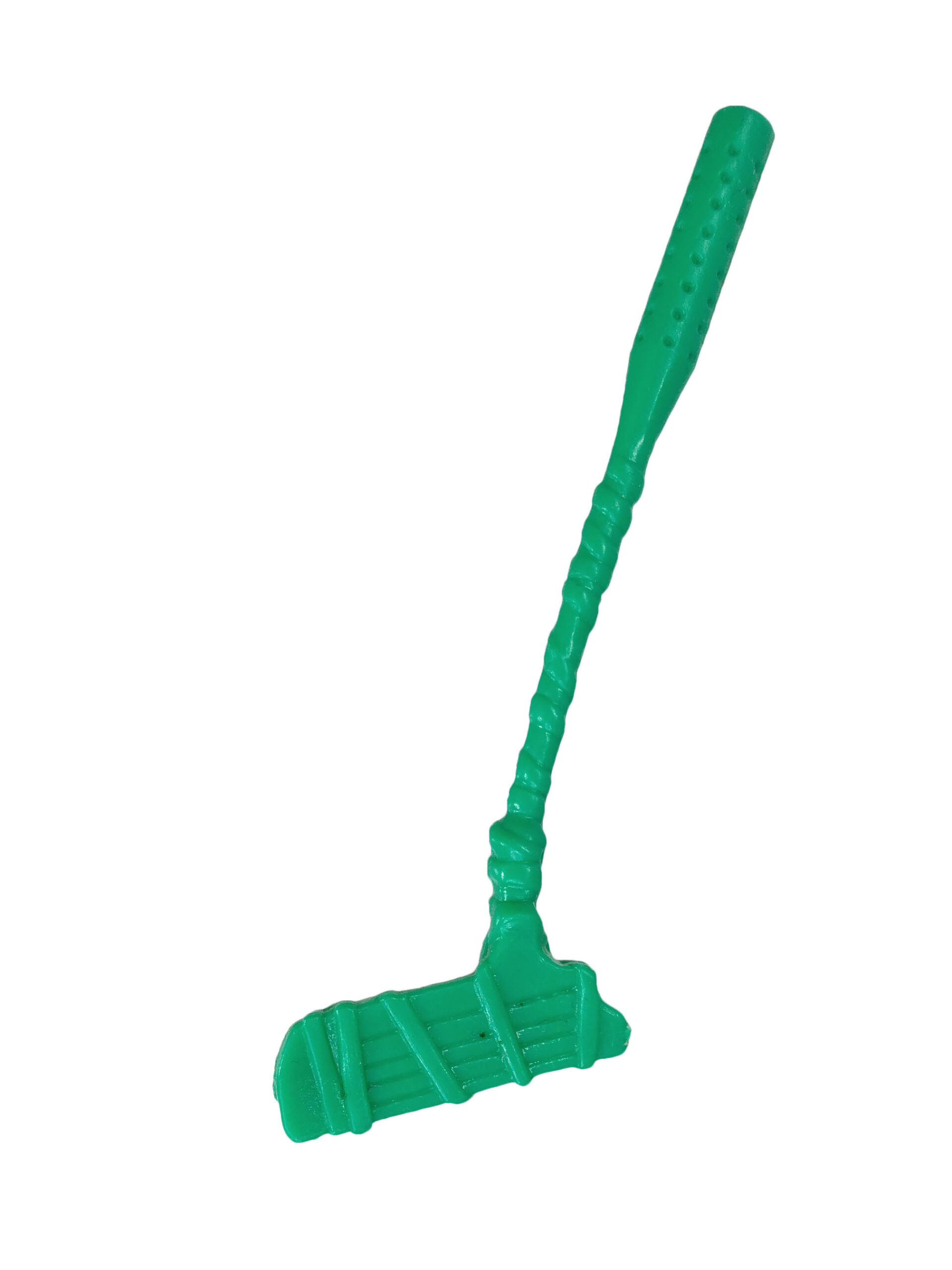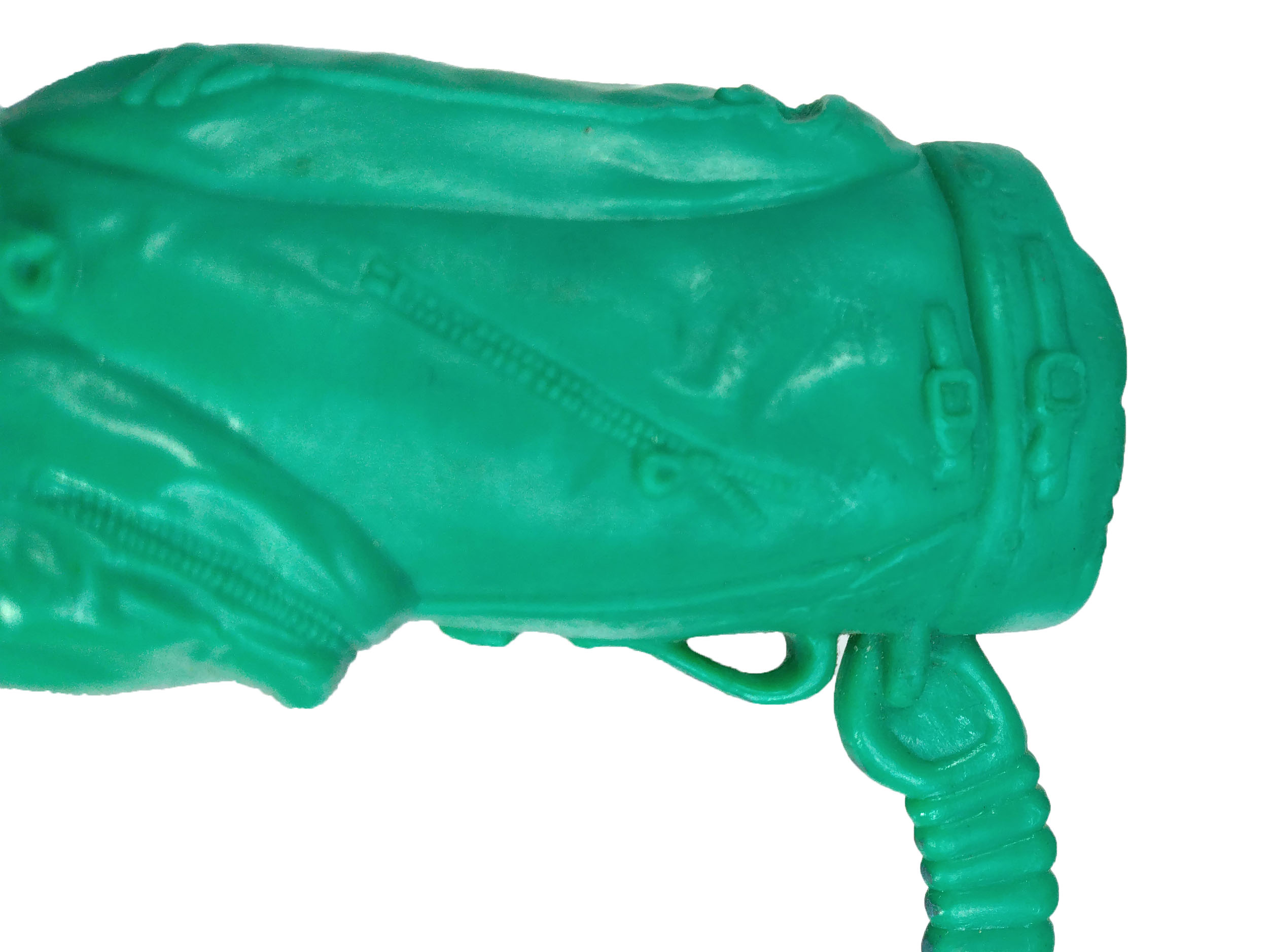 D’après Scott Hensey, qui a sculpté le personnage, deux visages étaient initialement prévus pour Casey Jones. L’un masqué, et l’autre dépourvu d’un masque. Ce second visage n’a jamais vu le jour et ne peut être observé qu’à travers de rares photos (Fig. 4). Du côté des accessoires, les précieuses images de Matt George permettent de mieux apprécier certains détails. Ainsi, nous découvrons que le club de golf a été sculpté à partir d’une tige de plastique (une sucette ou une paille ?), de cire et de lanières apposées (Fig. 5).