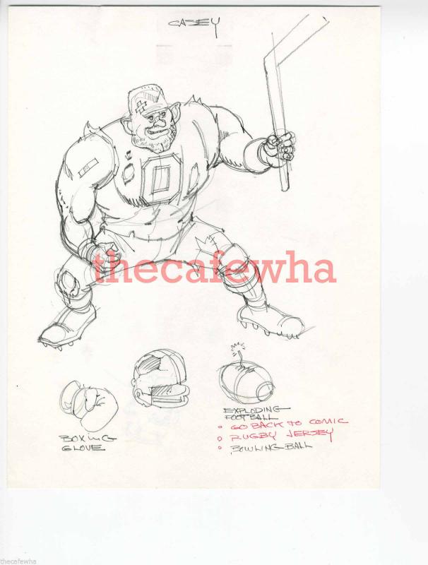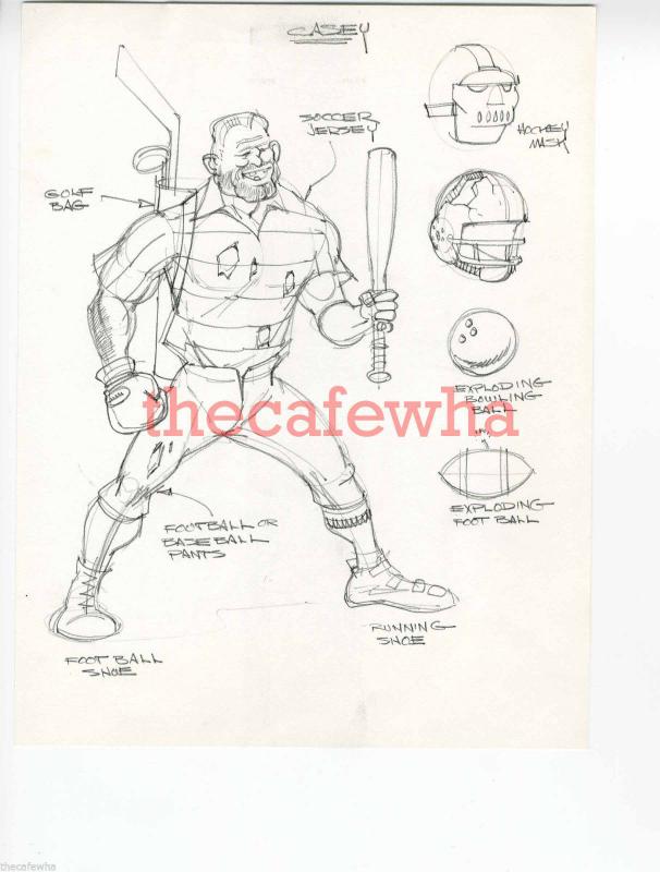 Au travers de ces deux dessins, nous voyons que l’univers de Casey Jones tournait de manière exubérante autour du sport, que ce soit par sa tenue ou par ses armes. Sa carrure et sa posture sont celles d’un joueur de football américain, l’une des pistes sérieusement envisagées pour ce personnage. Il aurait pu porter un casque tiré de ce sport ou un masque de hockey. Un t-shirt de football et un short de baseball ou de football américain. Des crampons de football au pied droit et une chaussure de course au pied gauche. Finalement, seul le sac de golf aurait réellement été inspiré du personnage des comics. Au niveau de son armement, un ballon de football américain explosif a également été imaginé. Au final, ces designs rappellent beaucoup la figurine de Tombstone Tackle Ghost des Real Gostbusters, sortie justement en 1988 !