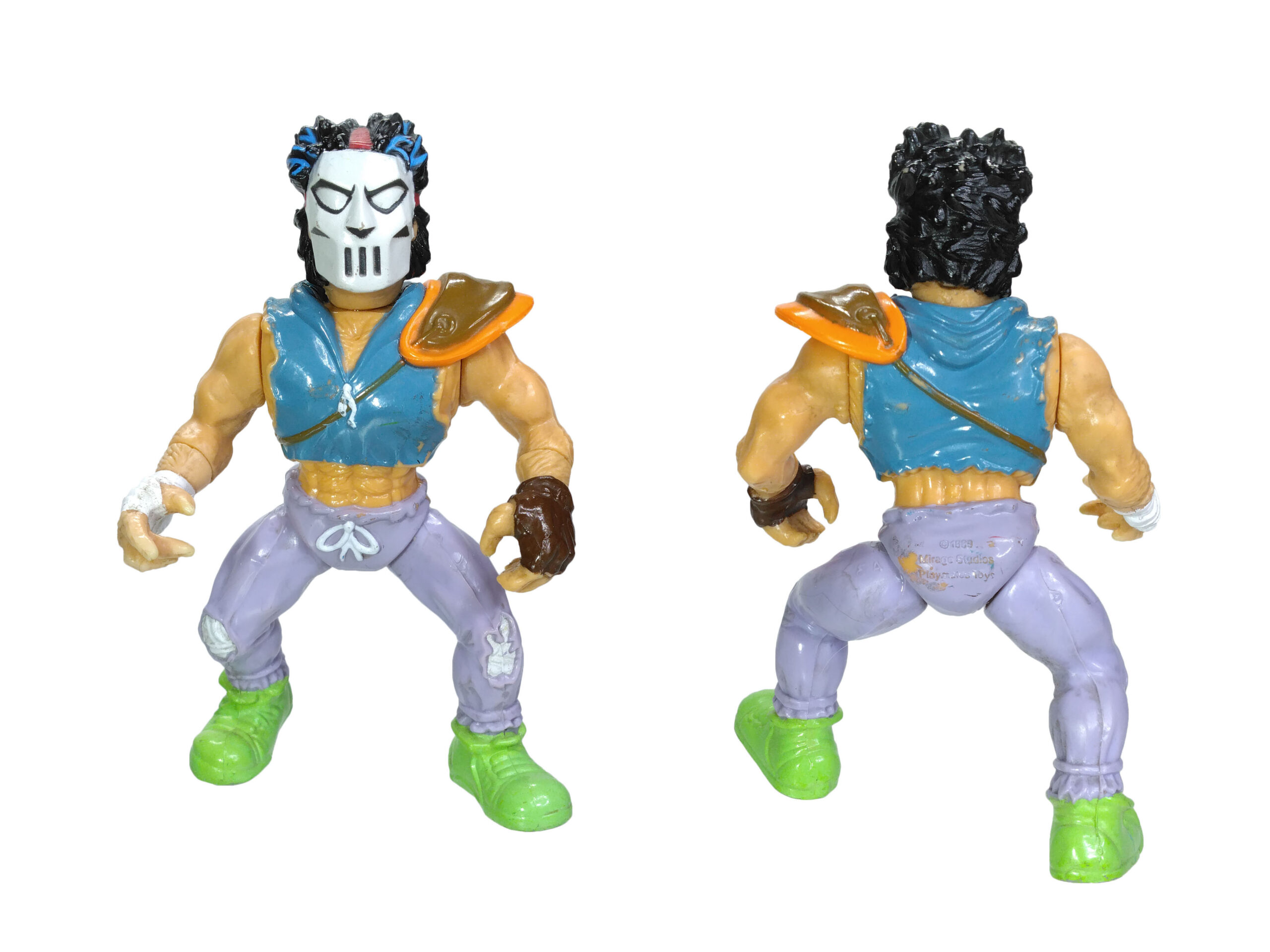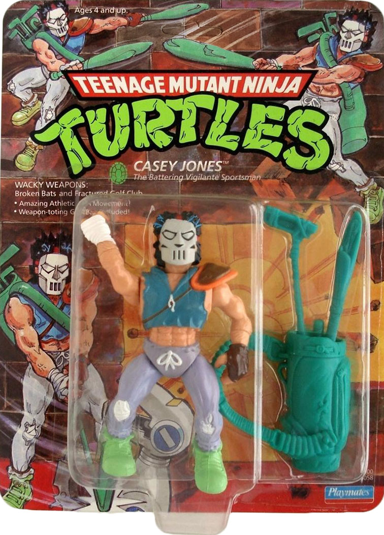 La figurine de Casey Jones est sortie dans la troisième vague de figurines de Playmates Toys, en fin d’année 1989. Sa conception représentait un défi à plus d’un titre pour le fabricant. D’une part, le justicier n’existait que dans les comics de Mirage et demeurait un personnage extrêmement important. D’autre part, son côté violent pouvait en rebuter plus d’un, à commencer par la production du dessin animé. Celle-ci était extrêmement frileuse à l’idée d’introduire un énergumène violent et masqué dans un programme destiné aux enfants. Ils préférèrent revoir certains de ses traits de caractères, pour en faire un individu stupide et névrosé pour expliquer son besoin de violence, toujours freinée par les tortues. Ainsi, Casey n’est apparu que dans cinq épisodes de la série, principalement en saisons 3 et 4, dont le premier, Casey Jones, hors la loi (S3 E20) été diffusé en novembre 1989, soit plus ou moins à la même période que la sortie de la figurine.
