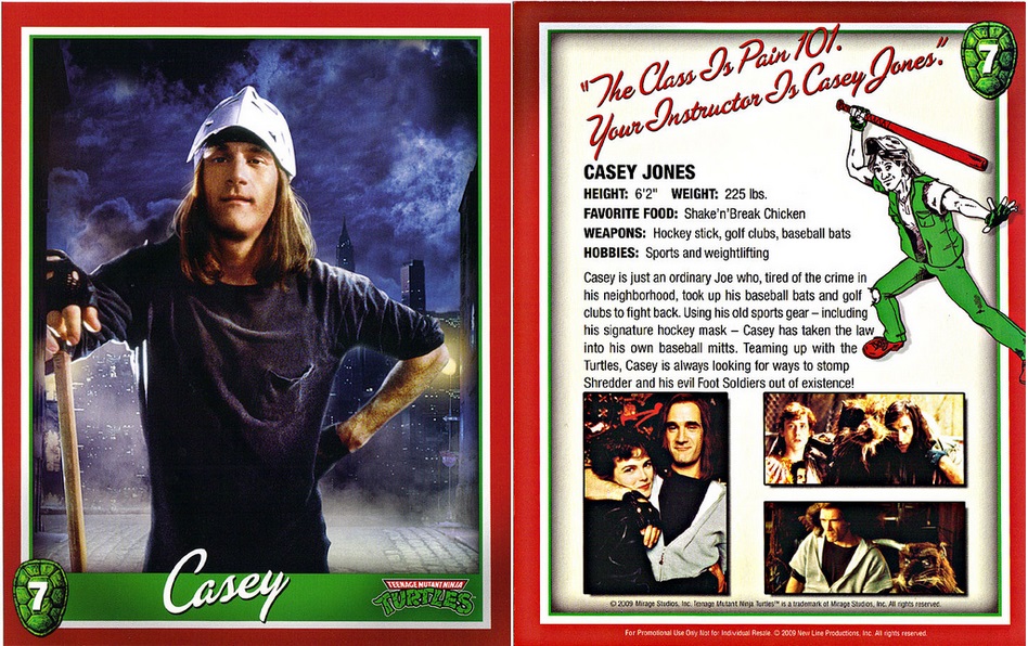 - Casey Jones n’eut qu’une seule figurine réalisée par Playmates Toys pour le troisième film. Cette figurine est nommée Whit, l’individu britannique qui lui ressemble, en provenance des îles britanniques du XVIIe siècle, accompagné d’une catapulte. La base de la figurine est elle-même une reprise du Casey Jones de 1989, revêtant un tissu blanc. Son visage pouvait être caché par un masque de hockey et des longs cheveux, le transformant ainsi en Casey Jones.