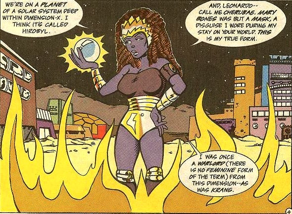 Cherubae était une puissante seigneuresse de guerre de la Dimension X. Après l’arrivée de la Théocratie, elle et les autres seigneurs avaient été sévèrement réprimandés. Si certains étaient restés cachés pour agir, d’autres avaient été exécutés. Cherubae avait choisi l’exil, tout comme Krang (TMNT A. #12).