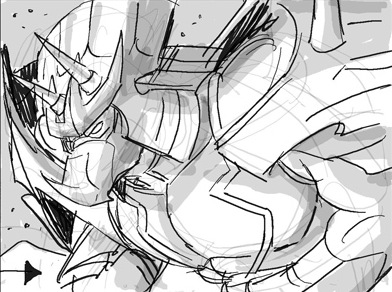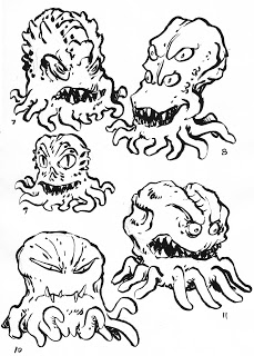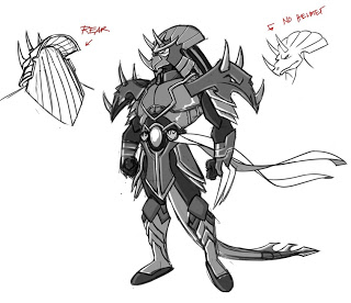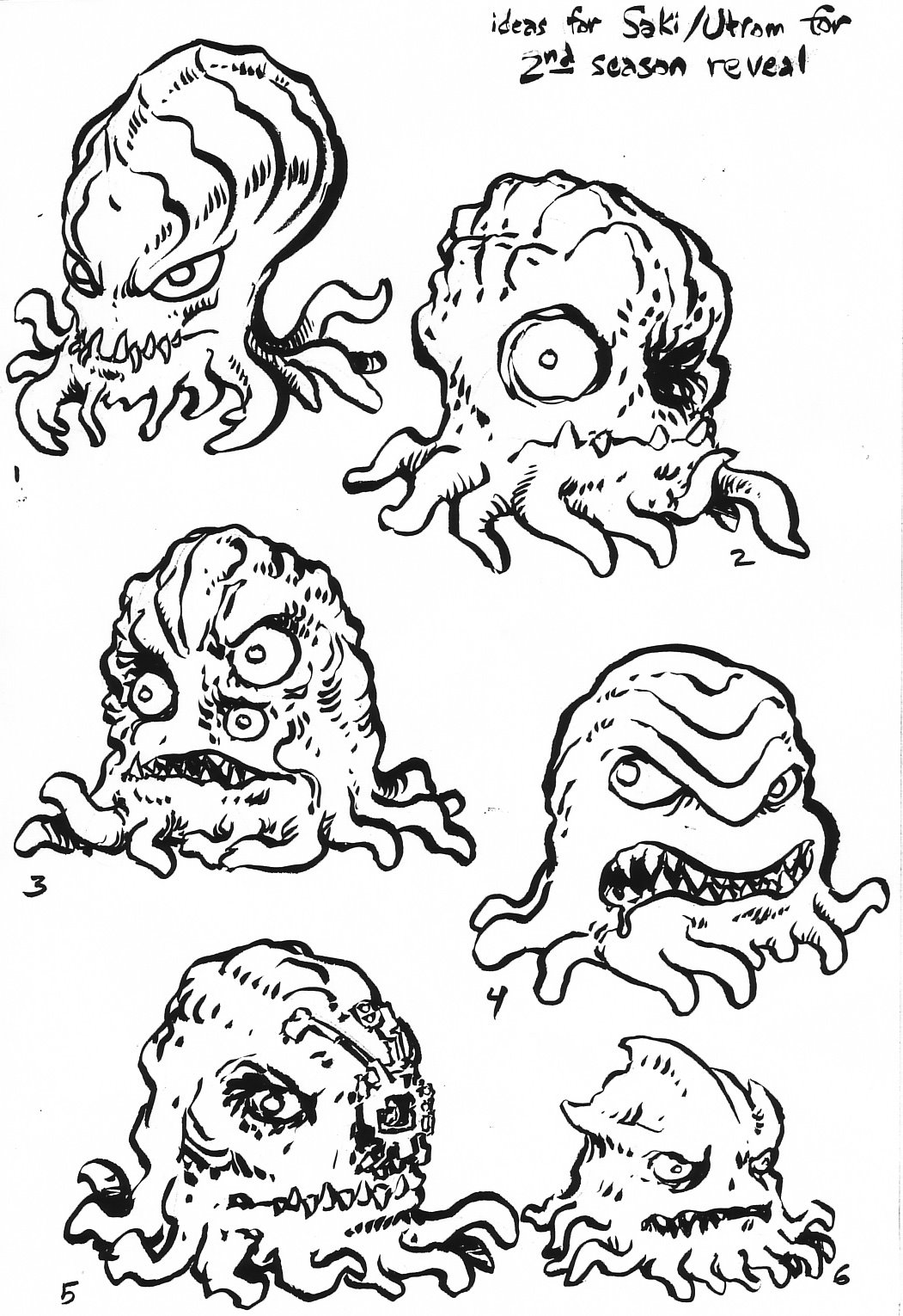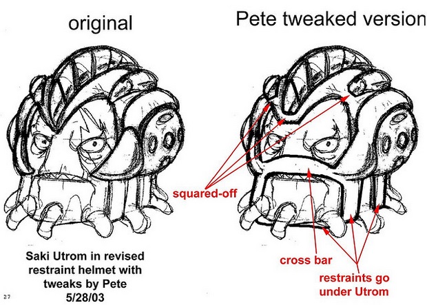 - Lors des premiers travaux de Peter Laird et de Lloyd Goldfine, le dessinateur voulait donner une apparence à la fois proche et lointaine des Utroms à Ch’rell. Laird a réalisé ces deux pages de concept art sur Ch’rell pour trouver finalement le bon designRef.1. Sur la troisième image, on peut voir les modifications portées par Laird sur le design final de Ch’Rell étreint par le matériel carcéral Utrom. Le Ch’rell de gauche est la version proposée par 4kids, à la quelle, à droite, il propose quelques modifications « facilitant » sont évasion.