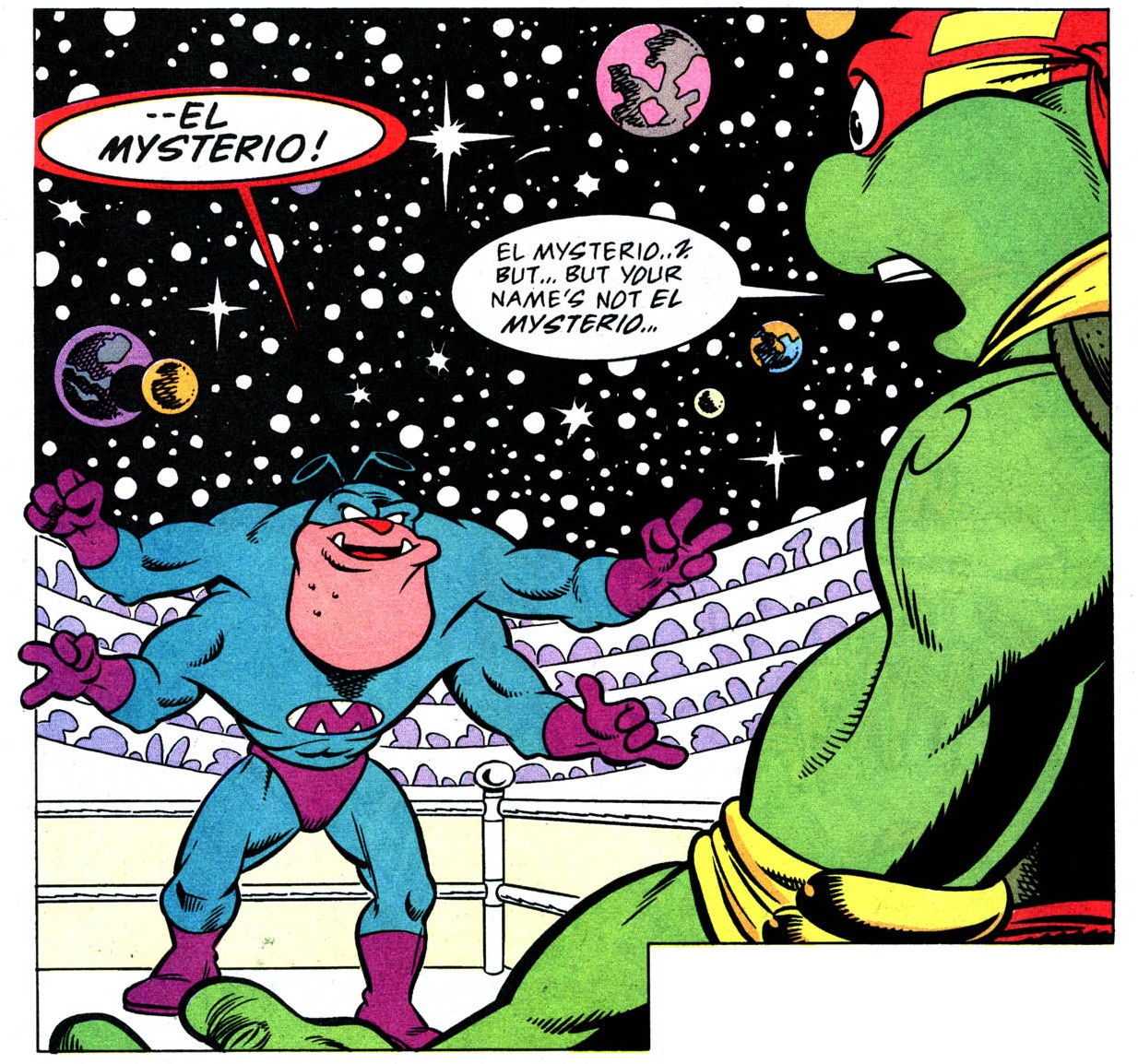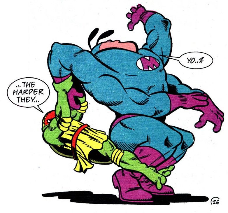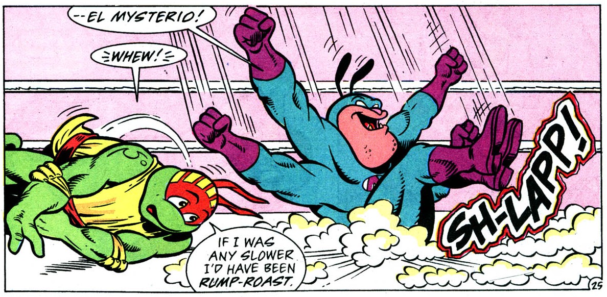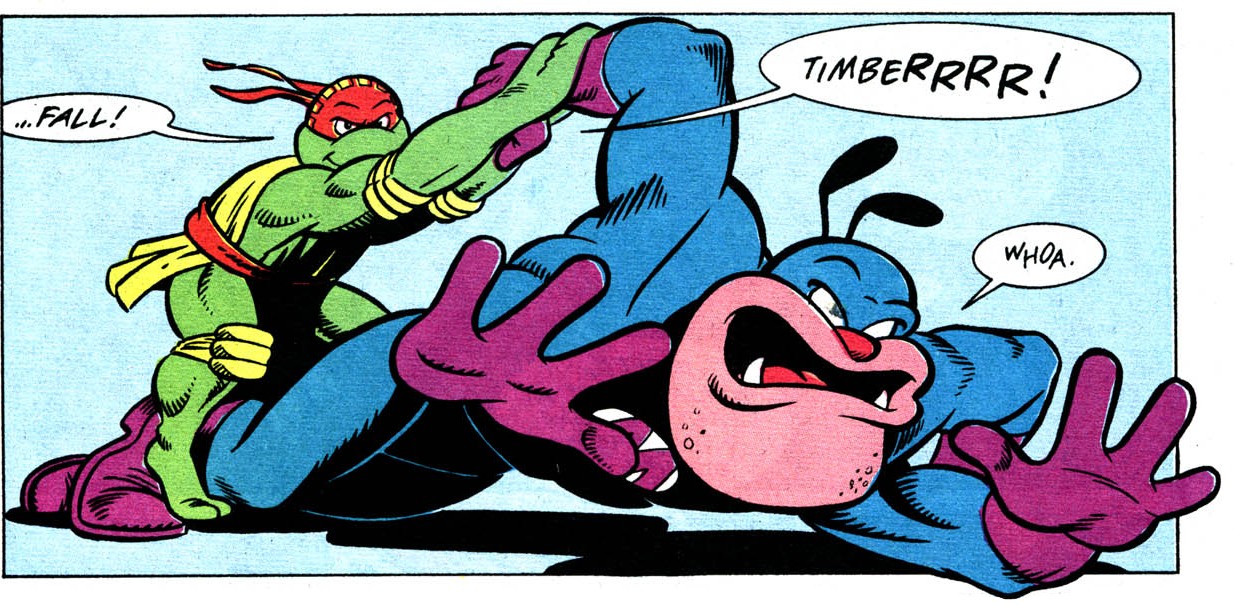 Les tortues durent l’affronter à deux occasions sur le ring. La première fois, les ninjas réussirent à le vaincre alors qu’il étaient contraints par Stump et Sling de participer à leur tournoi intergalactique. Contre toute attente, Leonardo le sortit du ring d’un coup de pied sauté (TMNT A. #7).