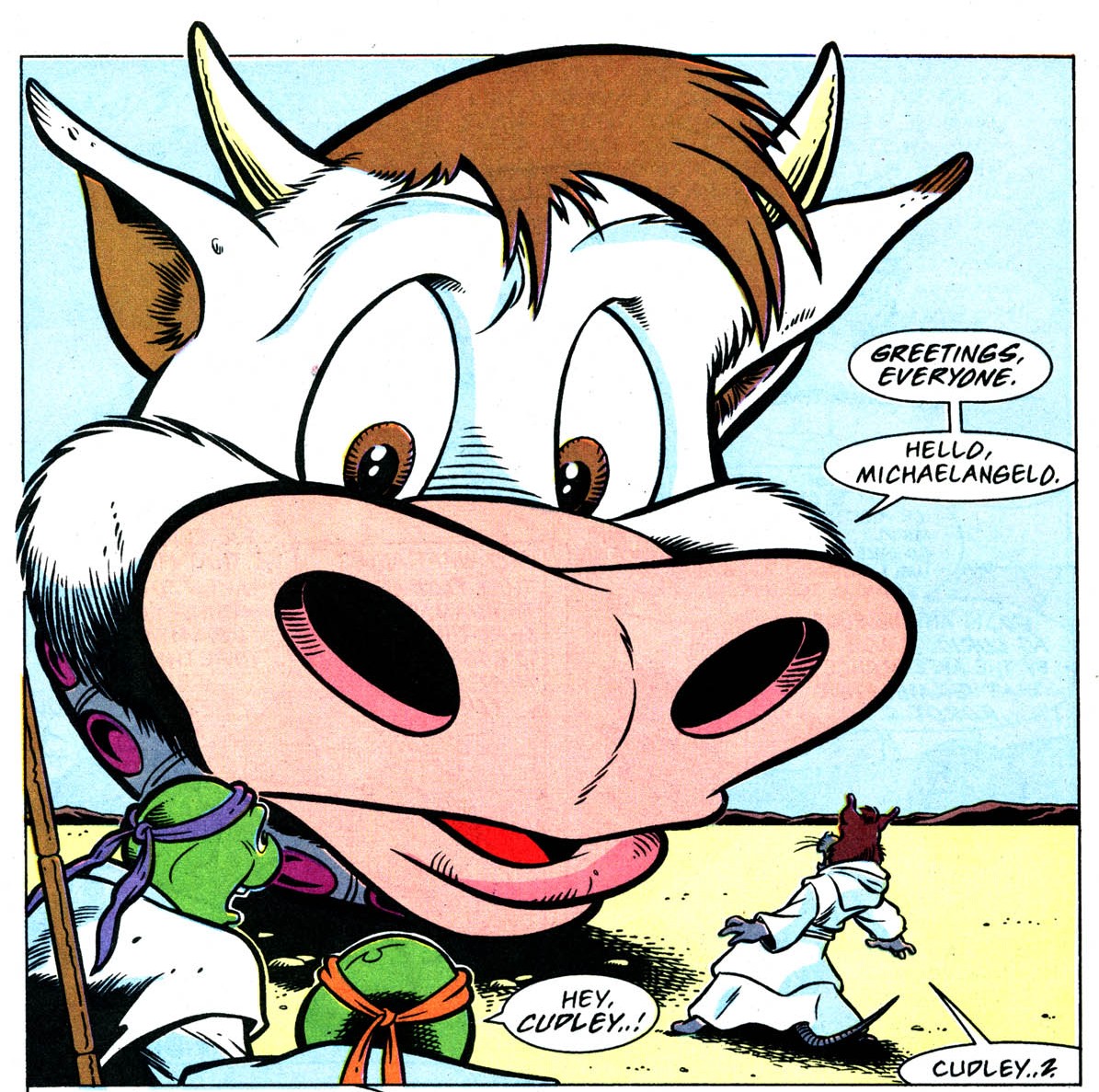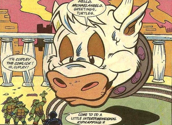 - Le personnage de Cudley peut surprendre à plusieurs égards. Son créateur, Stephen Murphy, explique dans le Comics interview #83 qu’ils avaient besoin de quelque chose pour envoyer les tortues en Dimension X. N’ayant aucune idée de quoi utiliser, Peter Laird lui aurait suggéré un extraterrestre géant. Soudain, Murphy pensa à cette vachette qui n’aurait qu’à lécher les tortues pour les avaler et les transporter où elle voulait. Il n’en semble pas très fier. Il termine en disant que Playmates n’avait pas envie d’en faire un jouet malgré leur proposition d’en faire une sorte de véhicule, notamment pour la série avortée des Mutanimals. La compagnie préférait faire des tanks et autres grosses machines à la place.