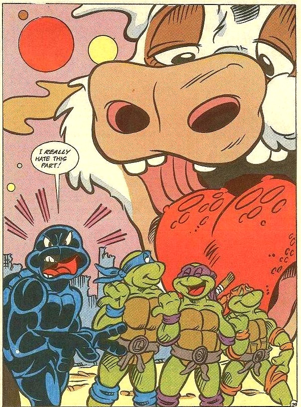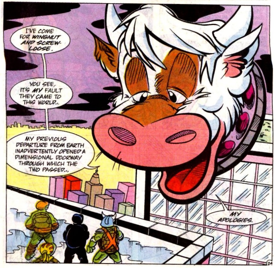 La vachette intergalactique s’était liée d’amitié avec les tortues après leur première aventure (TMNT A. #7). Il arrivait qu’il vienne en aide à ses amis, tout comme les Mutanimals. Sentant que le combat final contre Krang était proche, Stump lui demanda de passer un accord avec les tortues sur Hirobyl. Si elles acceptaient que la bataille soit retransmise sur les chaînes de catch intergalactique, il leur fournirait de l’aide. Ainsi, arrivèrent Wingnut, Screwloose, Trap et Leatherhead pour affronter les soldats Malignoids (TMNT A. #12).